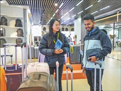 10月18日,2025中国·白沟国际箱包博览会在河北省高碑店市河北出口商品展示中心举办。本届博览会吸引来自俄罗斯、埃及、伊朗等50余个国家和地区的500余名国际采购商及100余家跨境卖家代表参会。图为外国客商在了解箱包产品。