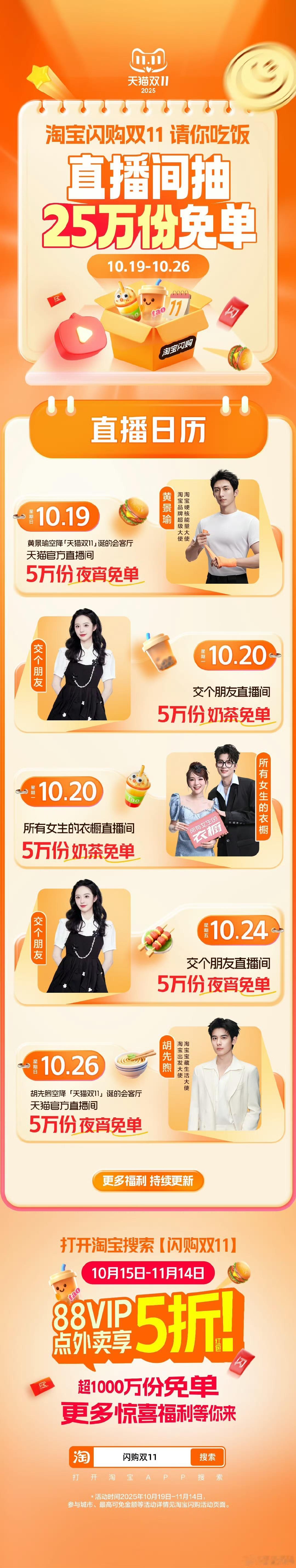 要被今晚黄景瑜的直播笑死,说好的健身主题呢?怎么爆改户外求生了!我们淘宝品牌超级大使黄sir还在直播间发了5万张夜宵免单卡,抢到的朋友请举手,没抢到也不要灰心,后续还有多场直播发卡等你来~10月20日-11月14日,上淘宝搜🔎【闪购双11】,88VIP点外卖享5折红包🧧。还有超1000万份免单大放量!这个双11淘宝闪购请你吃饭 也是被淘宝闪购请到啦!天猫双11淘宝闪购点外卖更优惠