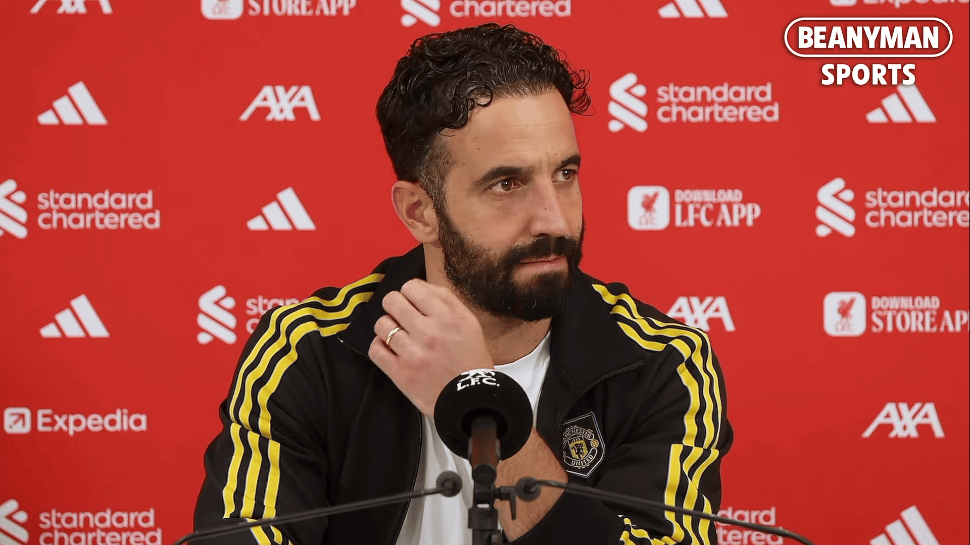 虎扑10月20日讯英超联赛,利物浦1-2曼联。赛后,曼联主帅鲁本-阿莫林出席新闻发布会。