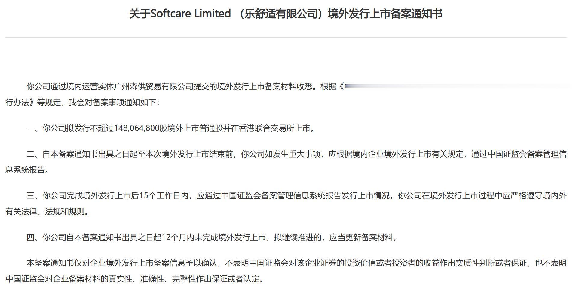 10月18日,中国证监会国际合作司发布《关于SoftcareLimited(乐舒适有限公司)境外发行上市备案通知书》。乐舒适拟发行不超过148,064,800股境外上市普通股并在香港联合交易所上市。