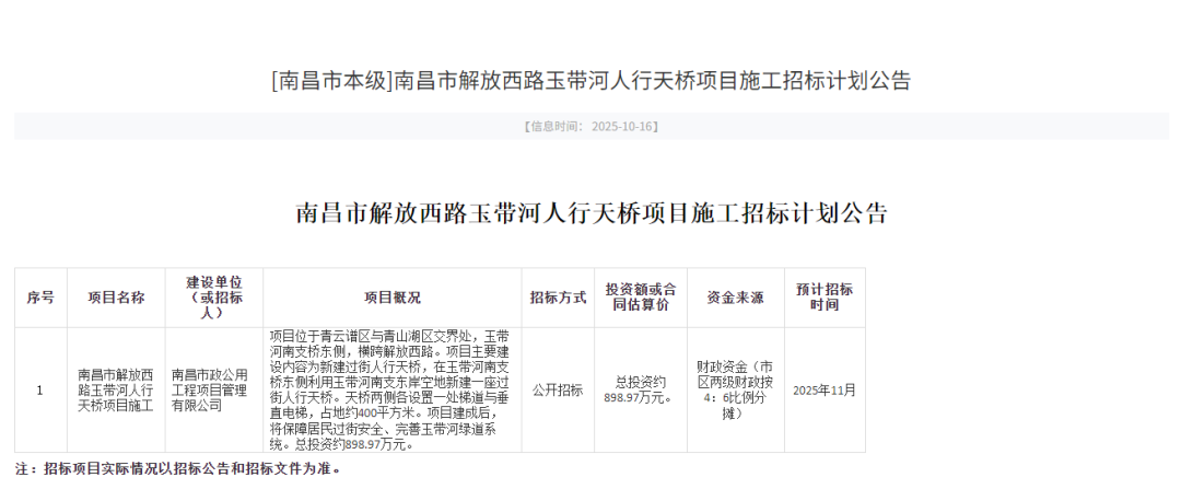 近日,江西省公共资源交易网发布了南昌市解放西路玉带河人行天桥项目施工招标计划公告,项目建设单位为南昌市政公用工程项目管理有限公司。