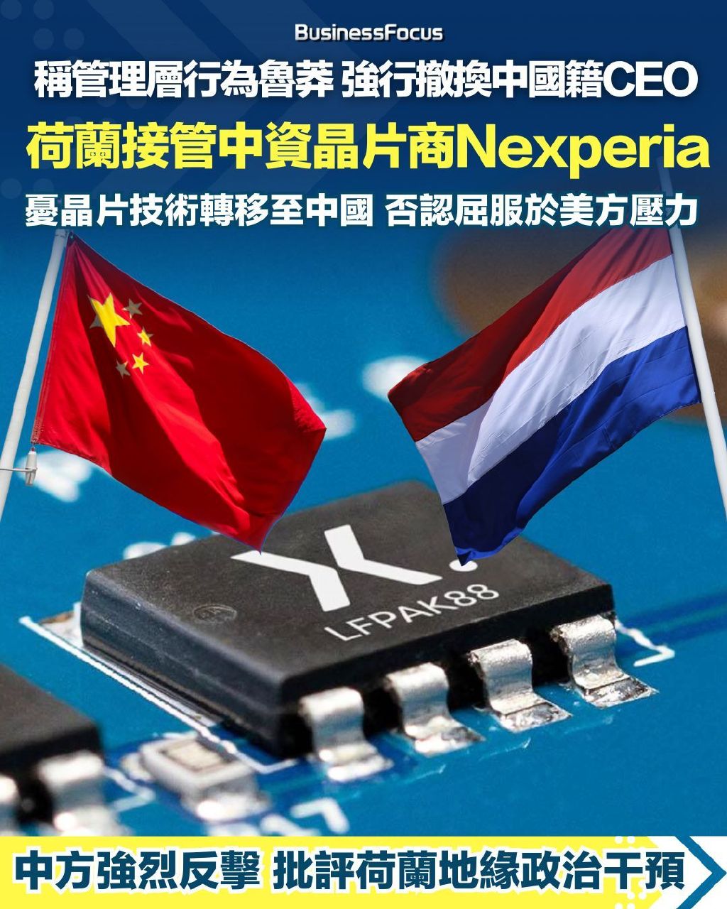 9月30日,荷兰经济事务与气候政策部依据《商品供应法》,以“安世半导体存在供应链紧急风险”为由,向安世半导体下达有效期一年的“禁令”,该禁令要求安世半导体全球除中国大陆外的30个子公司的资产、知识产权、业务布局及人员团队“保持现状”,禁止任何调整,荷兰政府称避免安世半导体“关键技术从欧洲流失”。