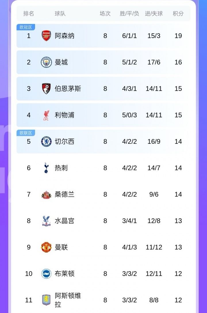 当前的英超第2名曼城到第9名曼联,仅仅只差3分,一个胜场就能追平积分。第10名布莱顿第11名维拉同样紧随其后。英超才8轮,其激烈形势可见一斑。