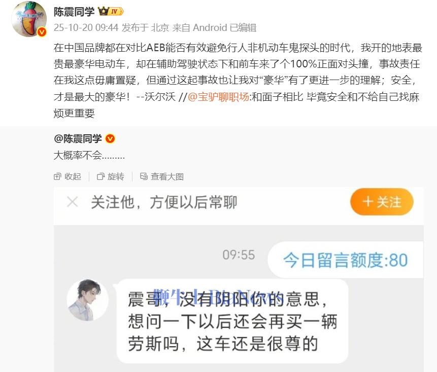 有网友曾询问陈震以后是否还会再买一辆劳斯莱斯,称“这车还是很尊的”,陈震回应“大概率不会……”。他还称,劳斯莱斯闪灵已经卖了。