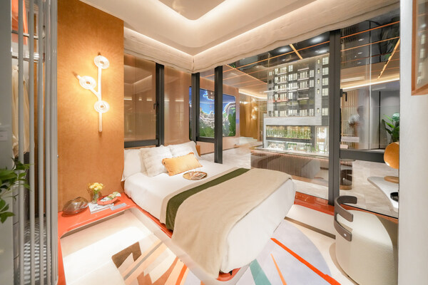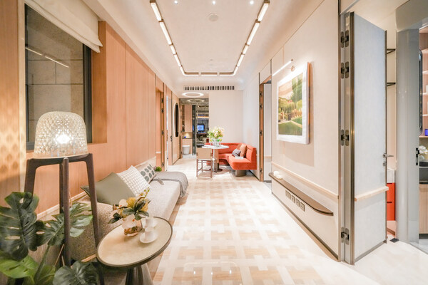 住宅大堂采用约8.8米高的双层"JewelBox"设计,悬挂以树木年轮为灵感的艺术吊灯"沐之光影",营造浓厚艺术氛围。升降机大堂采用暖色调设计,配合马赛克地板和拱型天花灯的间接照明,展现现代典雅风格。