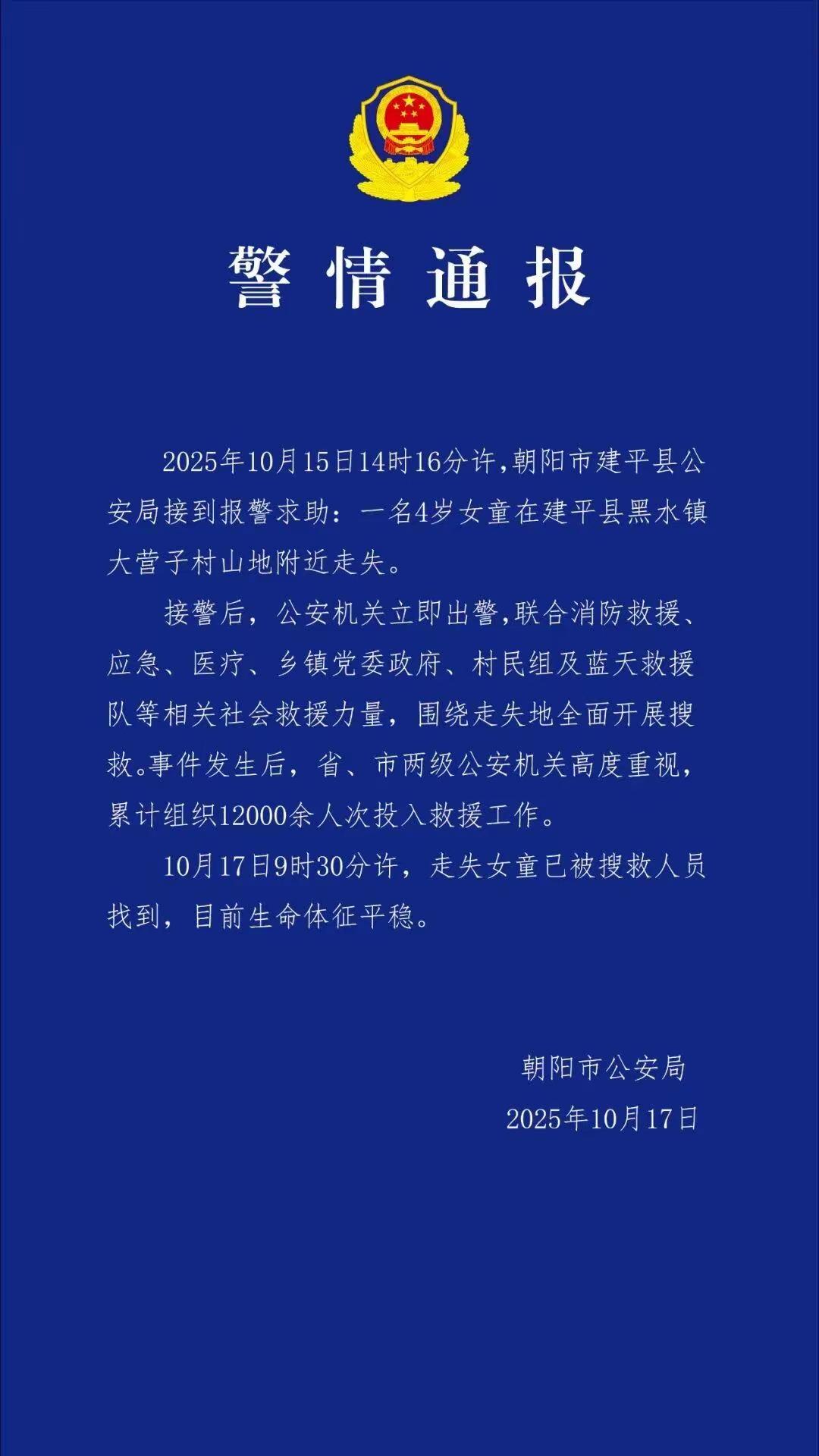 辽宁4岁女童迷路后睡草地失联44小时 其母发声:辽宁4岁女童小壹随爷爷奶奶干活时被留车内,睡醒后自行开窗下车找奶奶迷路。失联44小时后,被搜救人员在1500米外山沟草窝找到,意识清醒但体温低、面部有擦痕。救援有政府、民警、消防、救援队及村民等多方参与,母亲致谢称大家给了孩子第二次生命。