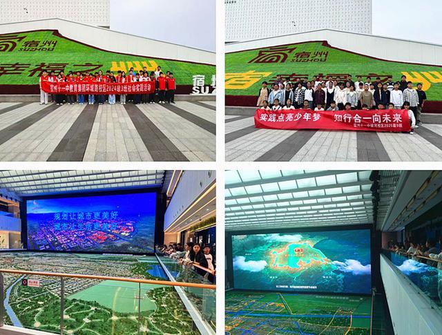 展望规划,激发创新思维。银河校区709班与环城路校区803班的同学们则共同走进宿州市城市规划馆,在“城市记忆”“规划蓝图”“未来展望”三大主题展区中,循着城市发展的轨迹,读懂家乡的过去、现在与未来。步入展馆,现代感与科技感扑面而来。巨大的LED屏幕、精致的沙盘模型、互动感十足的体验设备,无不彰显着这座展馆的现代气息。然而,在这份现代之下,流淌的却是宿州深厚的历史文脉。从“舟车汇聚,九州通衢”的古宿国,到唐宋时期的漕运重镇,再到“扼汴控淮,当南北冲要”的军事要地,历史的画卷在光影交错中缓缓展开。