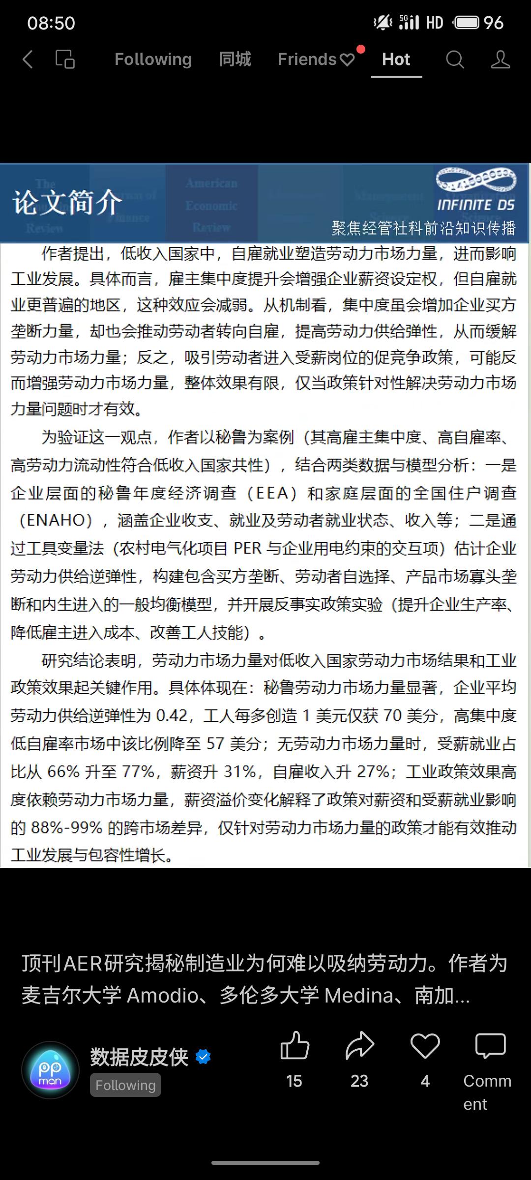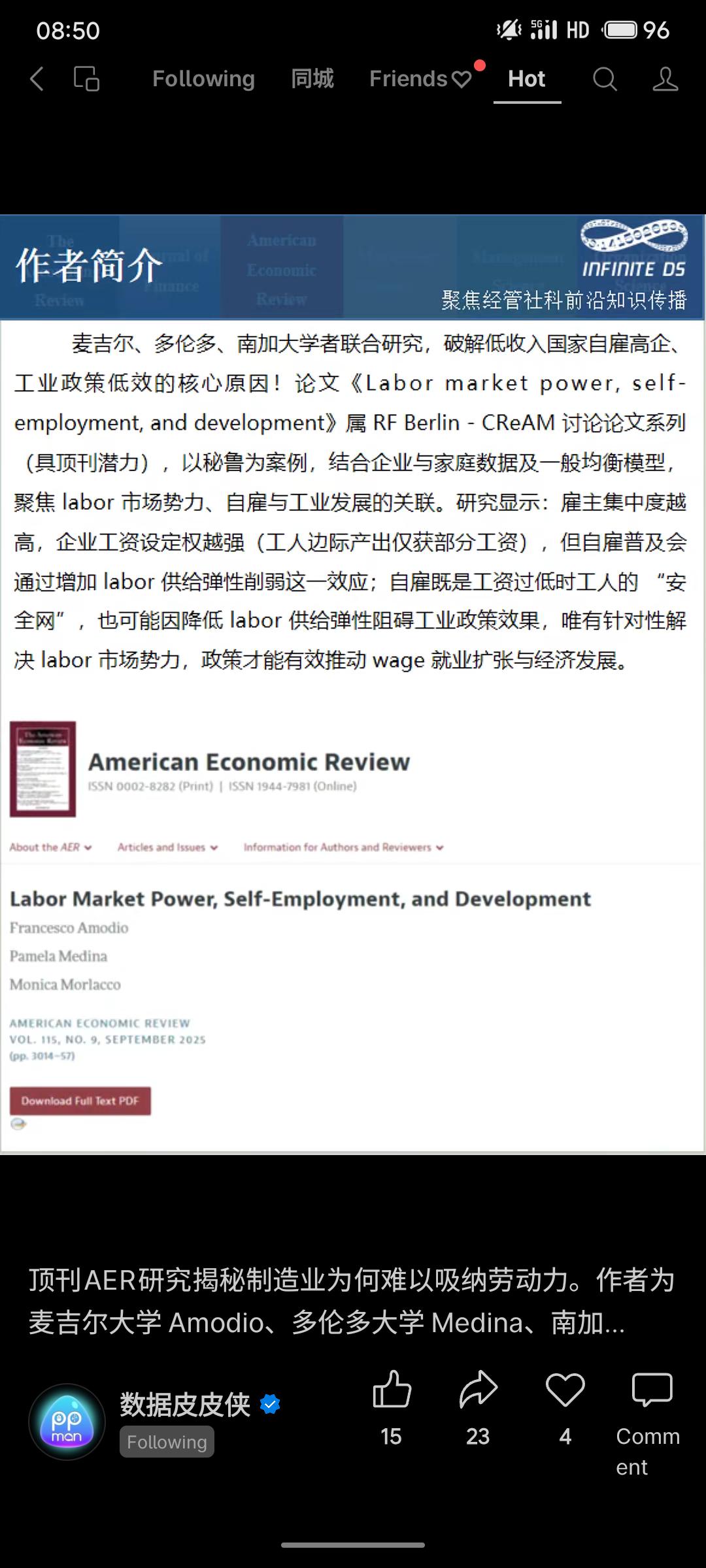 刊发顶刊当然一项研究指出,低收入国家制造业难以吸纳劳动力的核心原因在于劳动力市场势力与自雇行为的相互作用。雇主集中度越高,企业压薪能力越强,但普遍的自雇就业提高了劳动力供给弹性,削弱了这一效应。研究强调,若工业政策不能针对性削弱劳动力市场势力,反而可能强化企业议价权,从而难以有效推动受薪就业与工业发展。