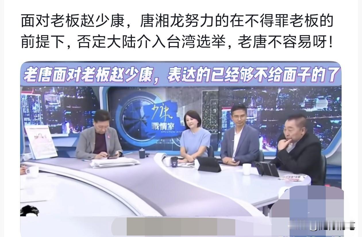 赵少康被这么多人口诛笔伐,其实唐湘龙是非常尴尬的。 唐湘龙的节目都是赵少康媒体大亨掌控的,很大程度上是让唐湘龙不愿意直接对赵少康评头论足的原因,虽然在很多议题上唐湘龙都有与赵少康非常不同的意见,但每每发表评论时都能够感受到唐湘龙很隐晦,特别是这次国民党主席竞选的“介选”闹剧,对赵少康表达强烈不满的评论员包括蔡正元、邱毅以及赖岳谦等,就连经常上赵少康节目的陈凤馨、栗正杰都公开质疑赵少康。但是唯独唐湘龙处于非常尴尬的境地,在维护他公正客观的评论风格与私下赵少康关系之间,唐湘龙变得两头难。