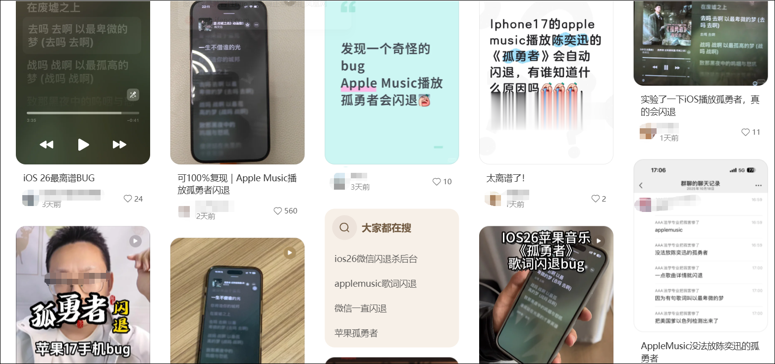 近日,多个网友发帖反映,在苹果iOS26.0.1版本中,使用AppleMusic播放《孤勇者》会自动闪退。