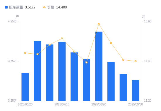日期A股户数(户)流通A股户均持股数(股)户均持股市值(万元)2025-09-30351375049.047.272025-09-19358754945.177.142025-09-10374084742.527.092025-08-20412254303.416.682025-08-08377804695.826.742025-07-31386054595.476.752025-07-18399444441.426.702025-07-10396134478.536.672025-06-30400624428.346.472025-06-20359924929.107.22