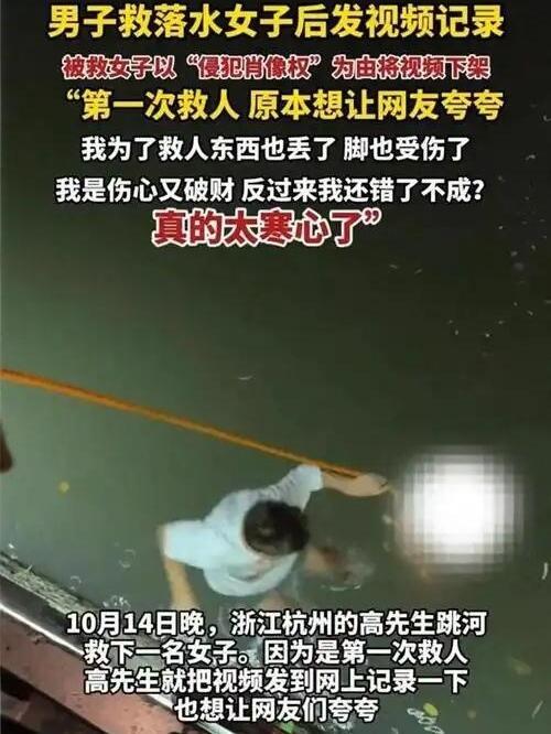 10月14号晚上杭州出了这么一档子事儿,一个女的掉水里了,幸好有个男的把她给救上来了。本来挺好一事儿,结果转头就闹出了纠纷。 救人这哥们儿大概是想留个纪念,也可能是想发网上让大家看看正能量,就把自己救人的过程拍成视频发出去了。谁知道被那女的看见了,她不但没感谢,反而反手一个投诉,说这男的侵犯她肖像权了。 现在法律确实规定,哪怕脸拍得不太清楚,但要是熟人能认出是你,或者有体貌特征、具体场景能对上,也算侵犯肖像权。这女的说自己落水时候的样子太狼狈,不想被人看见,更怕视频传开了影响自己生活。 这事儿真挺让人纠结的。你说救人肯定是好事,值得表扬,但被救的人也有权利保护自己的隐私啊。谁都不想自己最狼狈的时候被全网围观吧? 有人觉得这男的拍视频发网上有点太高调了,做点好事非得让全世界知道吗?但也有人觉得,人家毕竟救了你一命,发个视频怎么了?至于这么较真吗? 要我说,两边其实都有道理。救人是情分,保护隐私是权利。要是这男的发之前能问问那女的意见,或者把她的形象处理得更模糊一点,可能就没这出了。 你怎么看?觉得这男的做得对还是那女的有理?评论区聊聊呗!