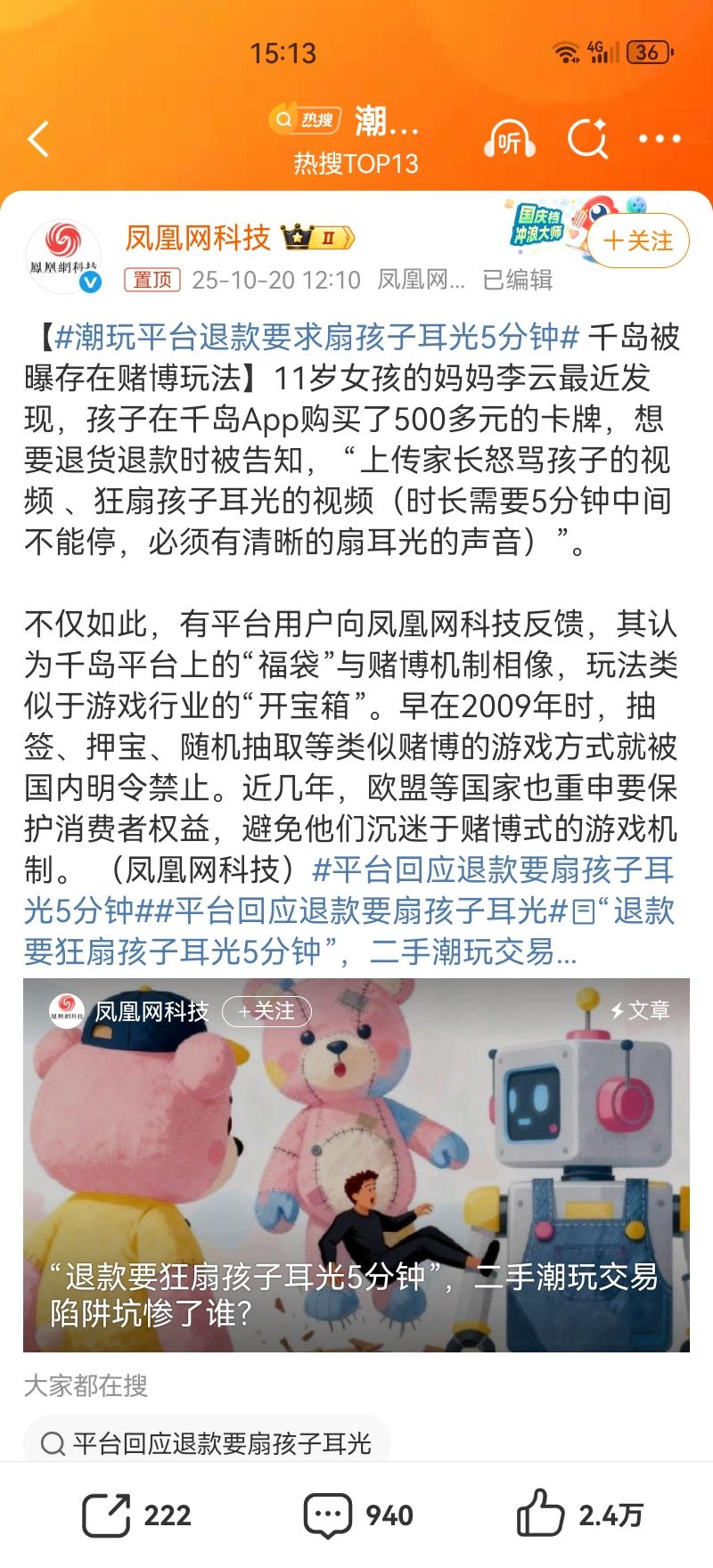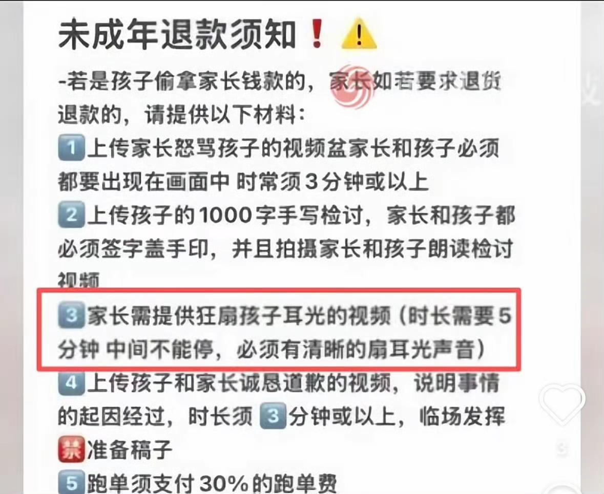这么嚣张吗? 难道自己没有孩子? 潮玩平台退款要求扇孩子耳光5分钟,要求声音清晰! 评论区是不是全是水军啊? 我不懂,评论区都是支持商家的,还有说商家这个要求是一个梗,是这样的吗?[what] 感觉平台一天天啥也不干,把商业风险都转嫁给了个人,就知道说建议协商,大家怎么看这个事情? 来源:凤凰网科技