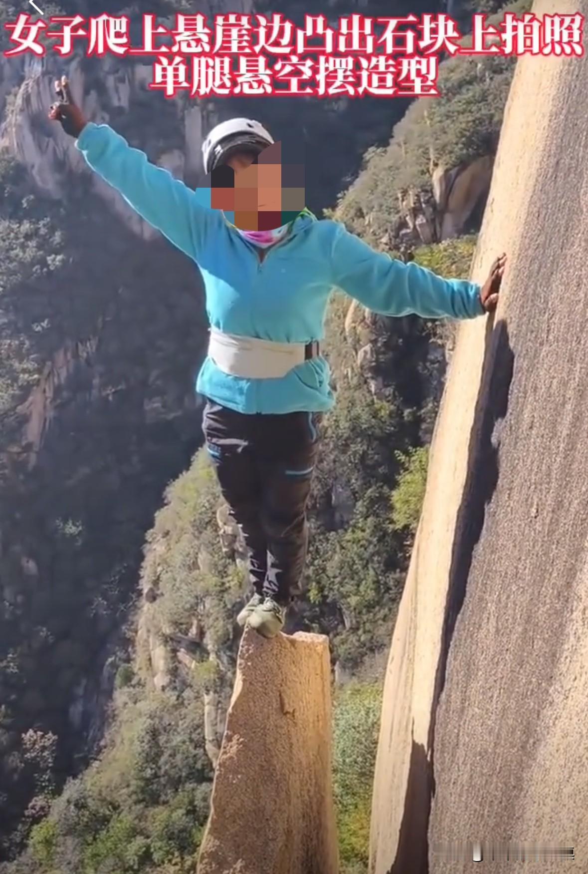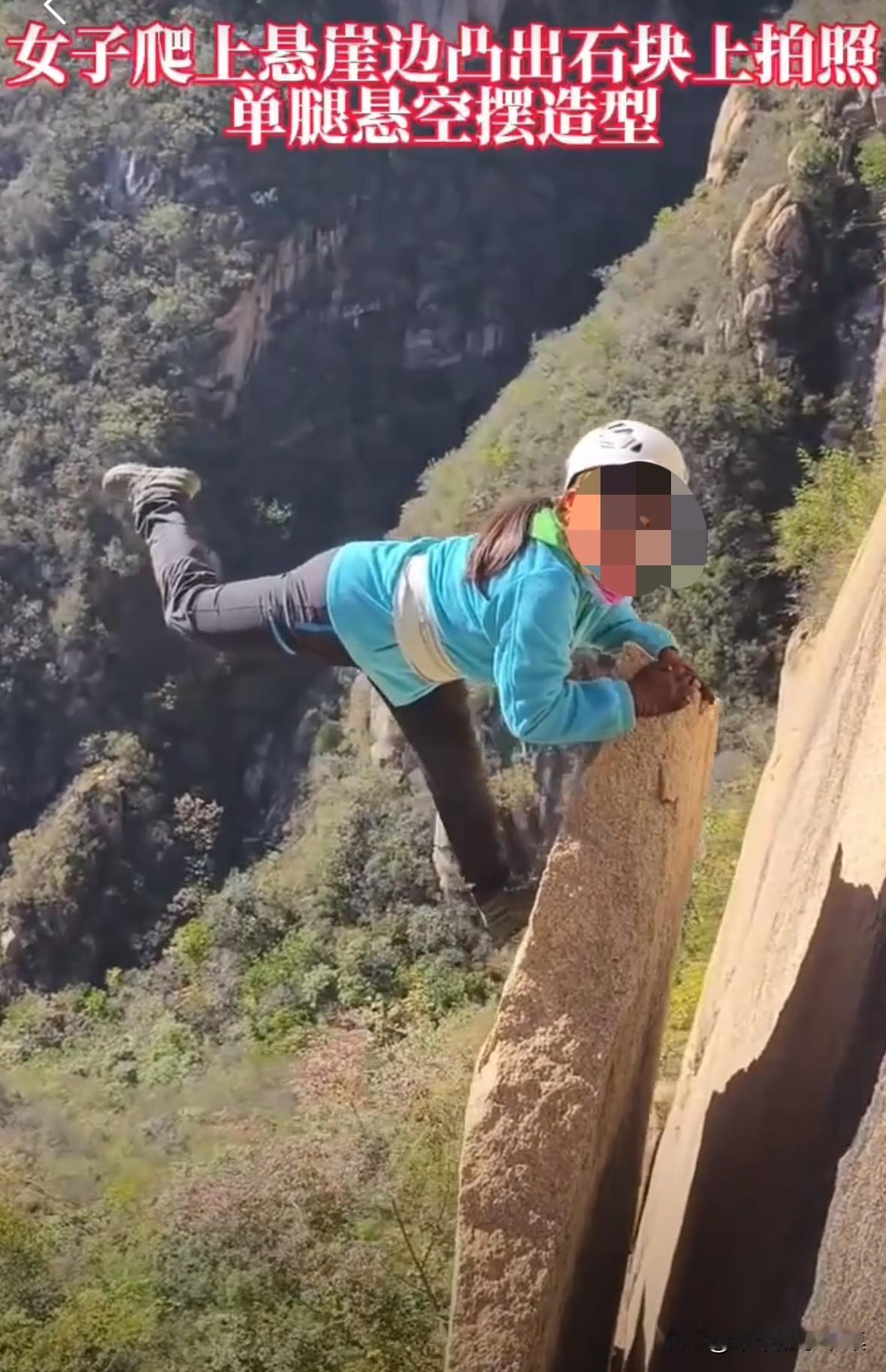 女子爬到悬崖峭壁的一块突出来的石头上拍照,而且还单腿悬空,下面的几千米的悬崖!