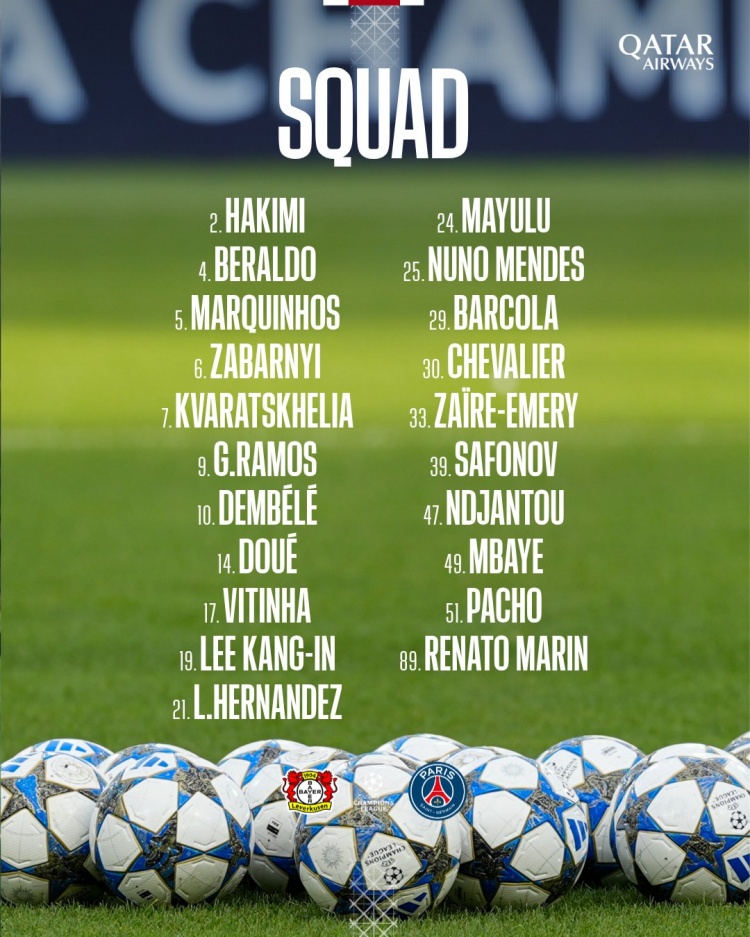 直播吧10月20日讯北京时间10月22日凌晨3:00,欧冠联赛阶段第3轮,巴黎圣日耳曼将客战勒沃库森。赛前,巴黎官方公布球队大名单,登贝莱在列。