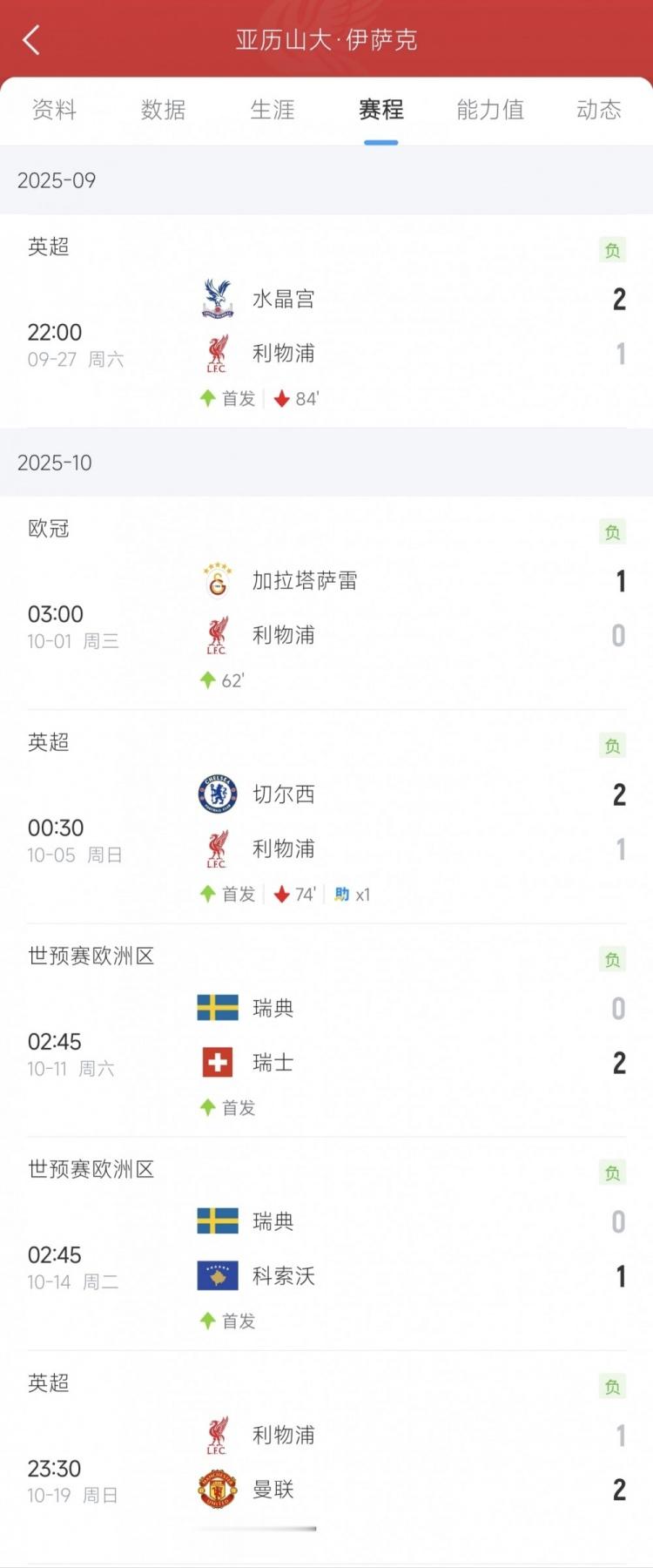 利物浦遭遇4连败,而伊萨克本人则遭遇各项赛事6连败!其中英超不敌水晶宫、切尔西、曼联,欧冠客负加拉塔萨雷,世预赛代表瑞典队不敌瑞士和科索沃。期间,伊萨克6场比赛仅在对阵切尔西的比赛中贡献1次助攻。
