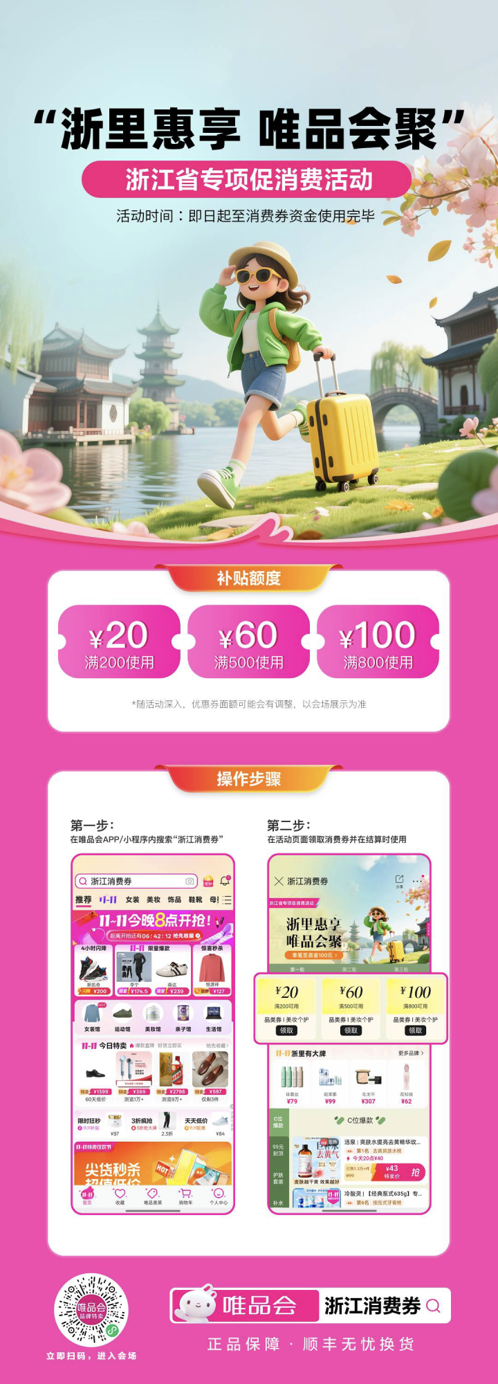 据介绍,活动期间,消费者在唯品会APP或小程序搜索“浙江消费券”即可进入活动专区领取政府消费券。首轮活动中,政府消费券分为满200元减20元,满500元减60元和满800元减100元三档,适用于活动专区内的大牌美妆护肤品,且单笔消费可叠加多件商品使用。消费券数量有限,先到先得。