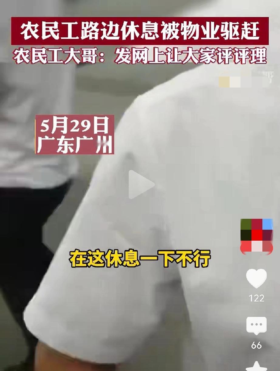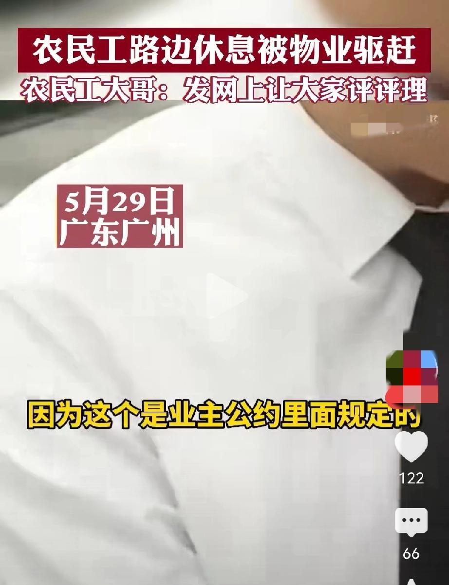 广东一农民工在路边休息被物业驱赶,其实我觉得这位农民工大哥生气的不是不让他在这休息,而是这位物业人员驱赶的方式和语气,过于生硬了,感觉被冒犯了。我有一个哥们也当过保安,以前我去找他玩的时候,他那个小区旁边有个在建的工地,有个民工在他们门前的花池上坐着,我哥们过去跟他说,大哥,要不您到我值班室坐会儿,我给您倒点水,或者我那有个马扎,您可以到那边的阴凉地儿坐会儿,主要我们领导一会儿过来,看到了该吵我了,您就当帮我个忙!”这农民工大哥一看,马上站起来,还递给我哥们一根烟,说不好意思啊,兄弟,我马上就走!你看这样多和谐!