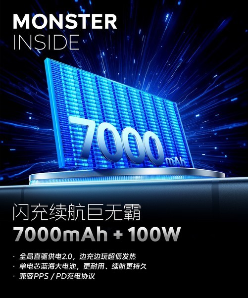 续航与补能的黄金组合更让游戏体验无后顾之忧。7000mAh蓝海电池采用新一代球形硅负极技术,电量储存能力较上一代提升50%,经中关村在线五小时重度续航测试仍剩余74%电量。100W超级快充兼容PD/PPS协议,彻底告别电量焦虑。