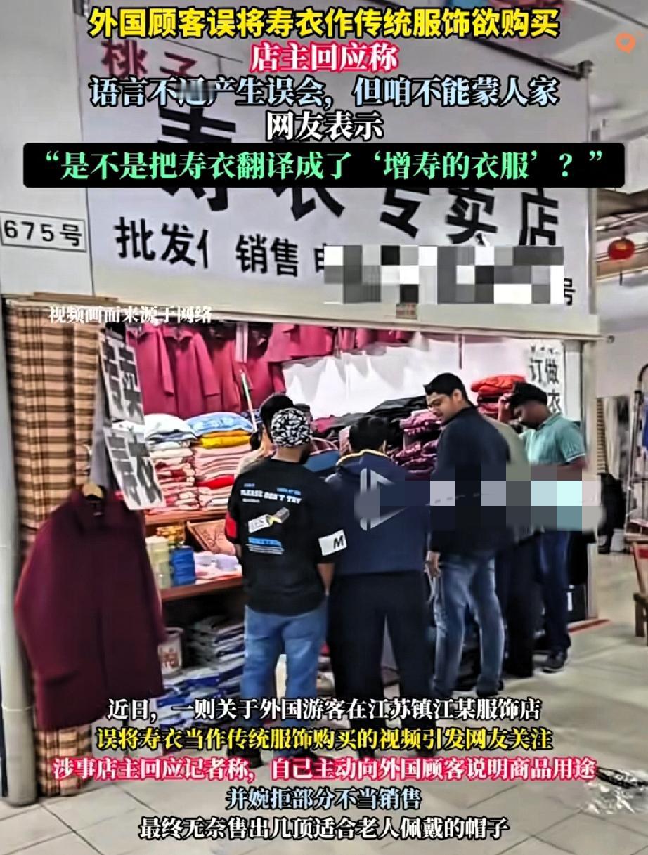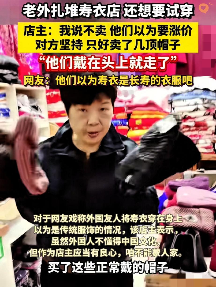 太乌龙了! 江苏镇江一群外国顾客冲进店里,拿着寿衣就往身上套,以为捡着宝了,把这当中国传统服饰想买走。 店主当场就急了,语言不通没法细解释,只能一个劲摆手说不卖,结果对方还以为是要涨价,反而更执着了。 最后老板实在没办法,只肯卖几顶百岁老人戴的帽子,还特意便宜了10块钱。 有人说这是文化差异没必要较真,但我觉得这恰恰是生意人的良心。 寿衣在中国有特殊含义,要是真含糊着卖了,等人家知道真相得多尴尬? 赚钱的底线,就是不利用信息差去糊弄人。 换作是你开店遇到这种事,会直接拒绝还是有别的更妥帖的办法?