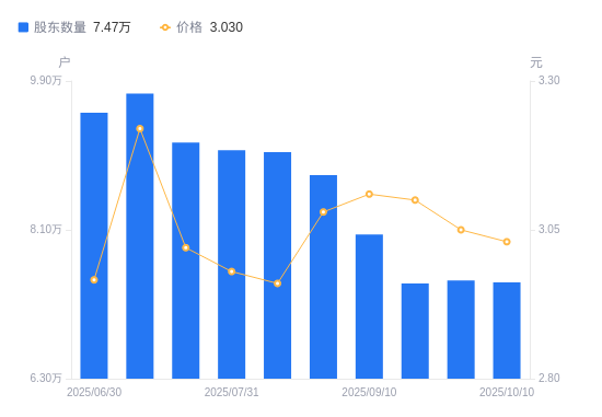日期A股户数(户)流通A股户均持股数(股)户均持股市值(万元)2025-09-307486330134.229.192025-09-197451230276.189.392025-09-108044528043.248.722025-08-208760825750.377.932025-08-109039924955.357.392025-07-319064324888.177.422025-07-189156024638.917.442025-07-109747823143.057.452025-06-309517423703.317.032025-05-309932922705.087.01