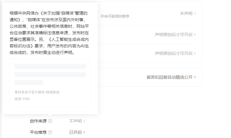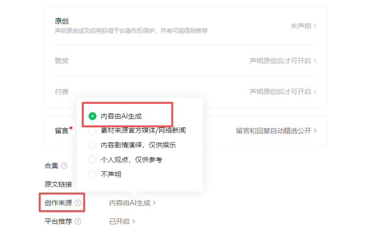 微信公众号平台上,在发布图文时,下方会有“创作来源”的选项,右侧的问号会提醒你,“根据相关规定,用户发布由AI生成的内容时,应当予以标注”。