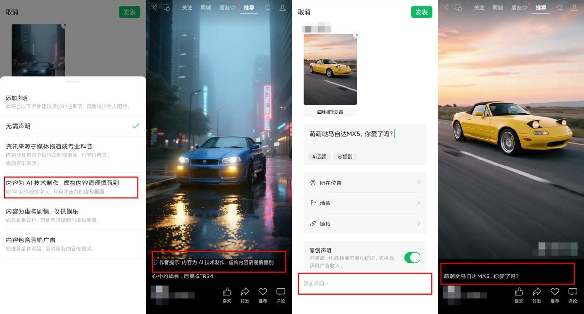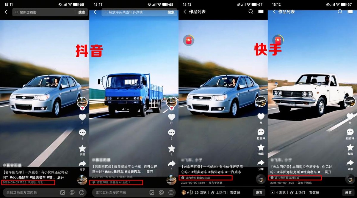 抖音只能添加已自主声明的视频,而不会进行自动识别和添加声明;快手平台无论是否添加声明,都会经过系统判断,凡是有AI生成嫌疑的视频,都会在下方添加“该内容可能由AI生成”的字样。