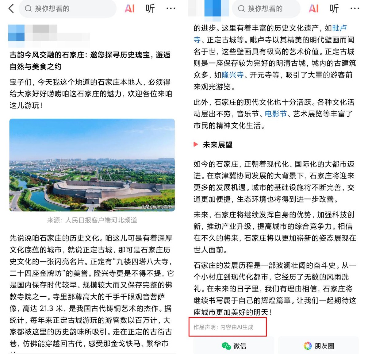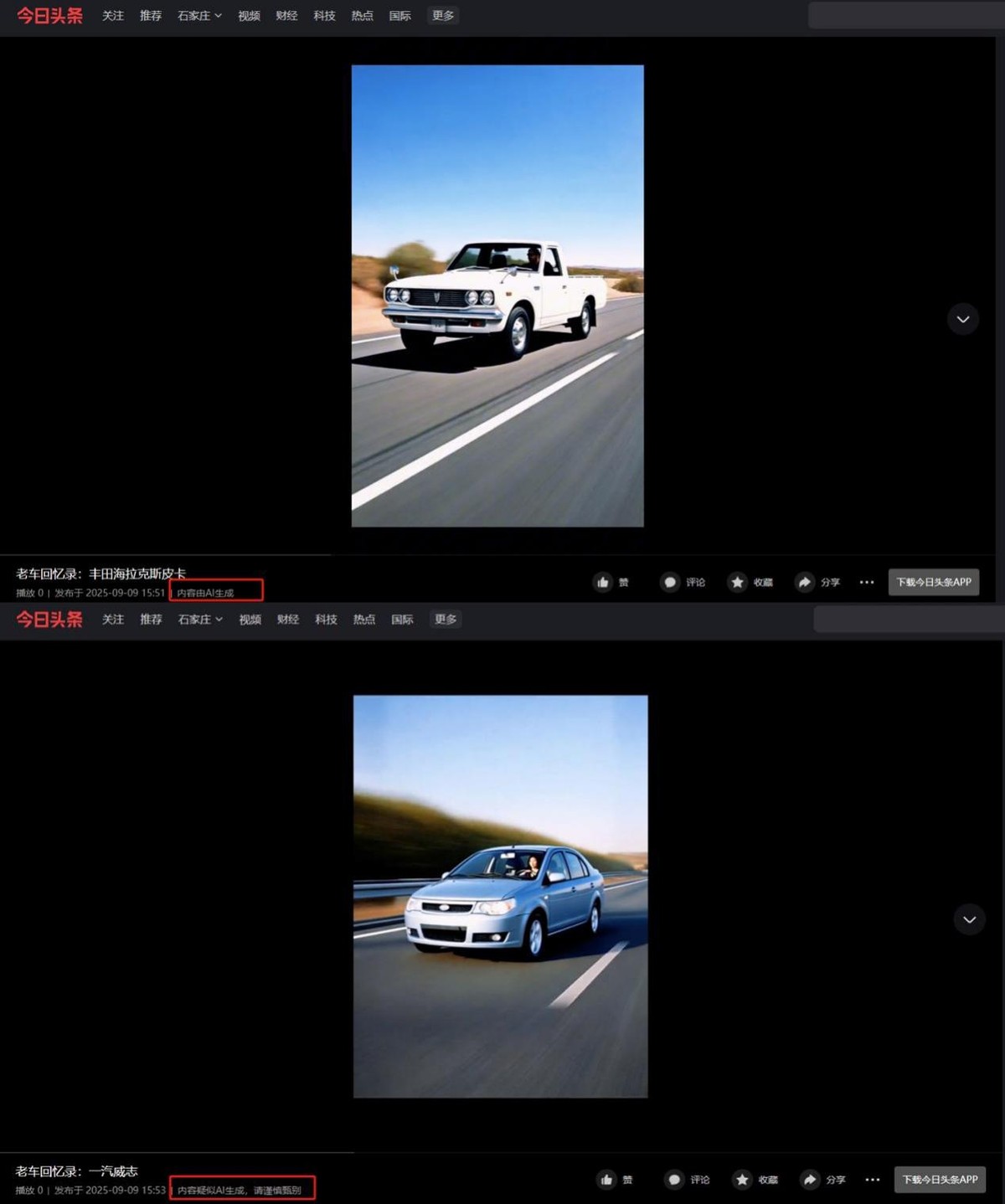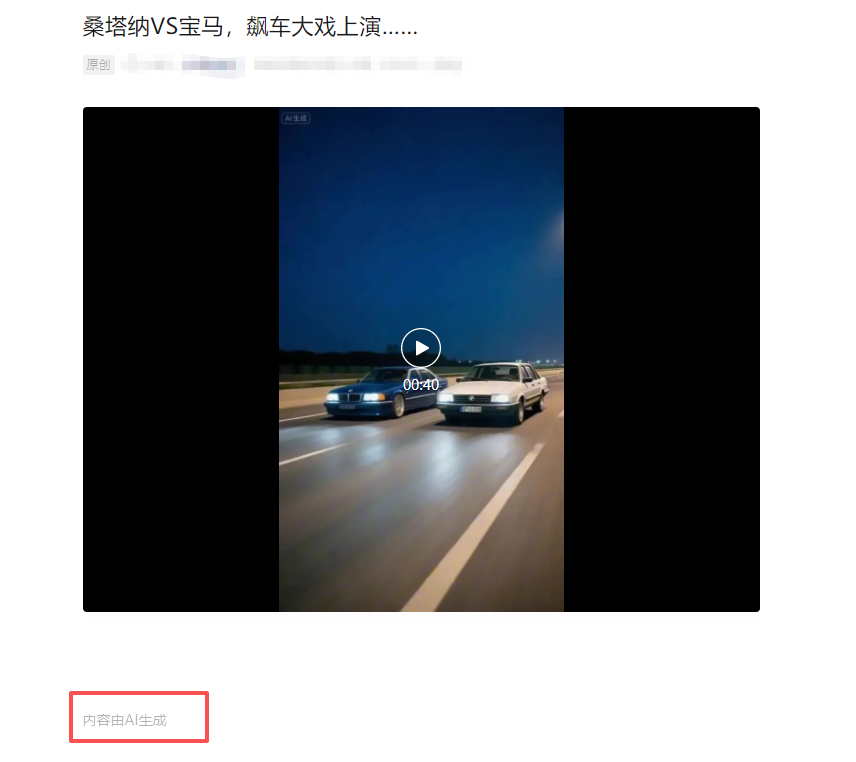 如果在今日头条后台发布AI视频,一段勾选了“AI生成”选项,一段没有勾选,则前者下方声明了“内容由AI生成”,没有勾选的下方则显示“内容疑似AI生成,请谨慎甄别”。
