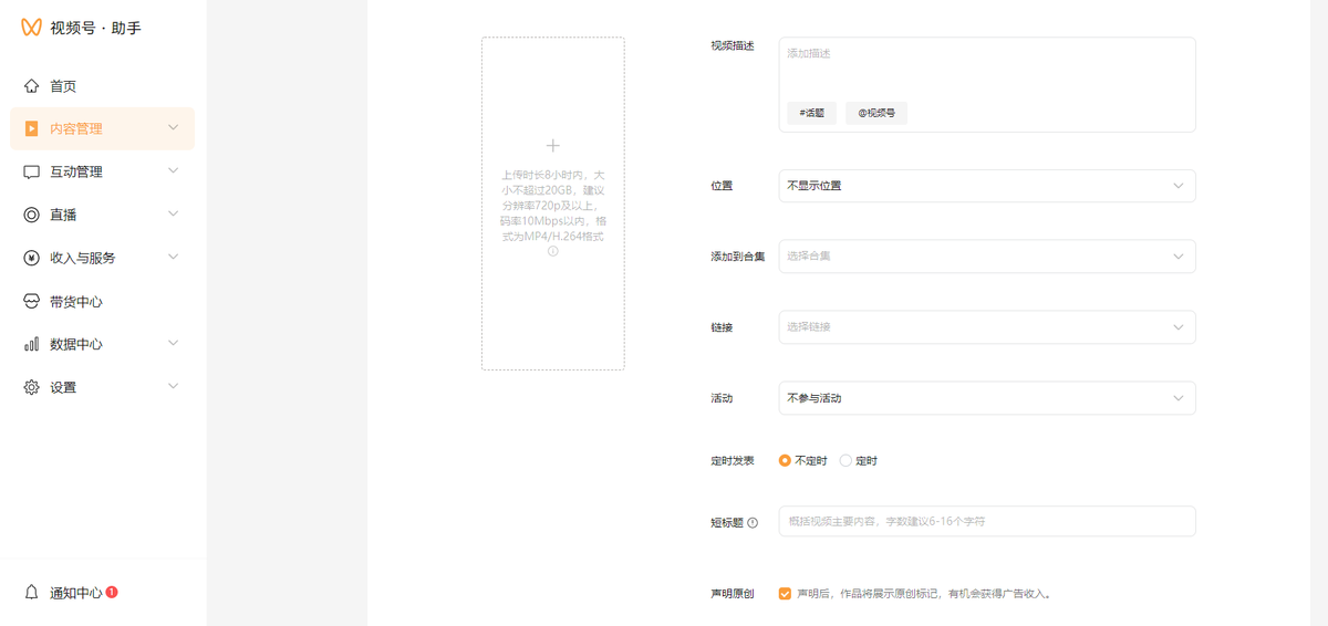 微信公众号的视频素材在上传到素材库的时候,只有原创声明,没有声明内容为AI生成的选项。
