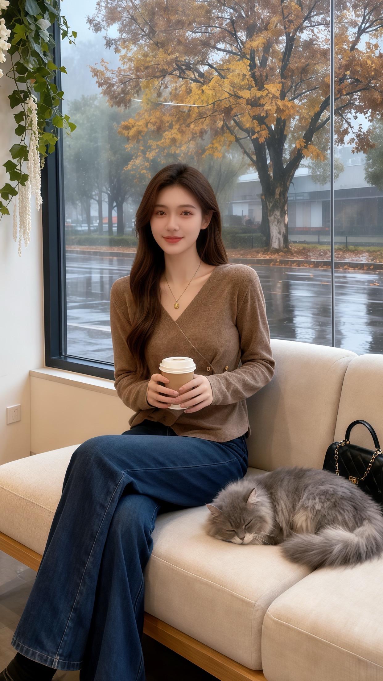 转身窝进沙发改方案,同款上衣让她在雪天里又舒适又有格调。白色博美犬蹲在旁望镜头,窗外雪压枝桠,木架上的小玩偶、多肉陪着她。