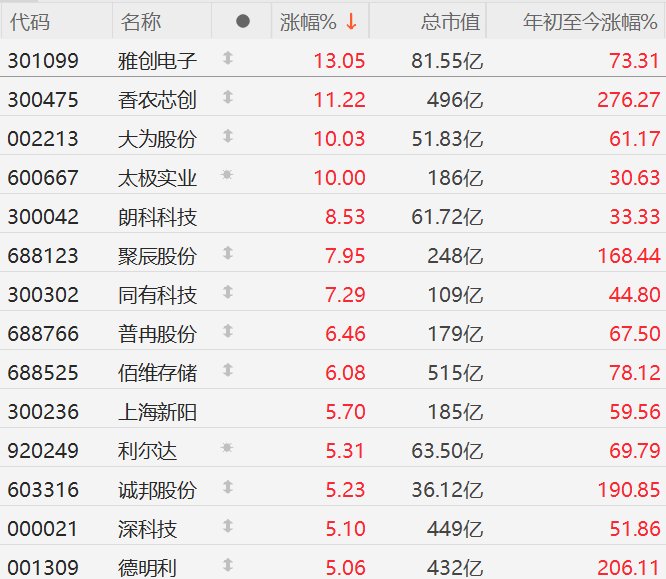 格隆汇10月21日|A股市场存储芯片板块集体强势,其中,雅创电子涨13%,香农芯创涨超11%,大为股份、太极实业10CM涨停,朗科科技涨超8%,聚辰股份、同有科技涨超7%,普冉股份、佰维存储涨超6%,上海新阳、利尔达、诚邦股份、深科技、德明利涨超5%。