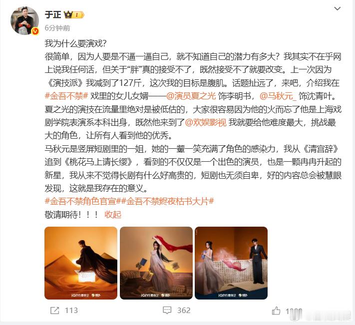 于正提到演戏对他来说是为了减肥,此外他还表示夏之光的演技在流量群体中被低估,这些