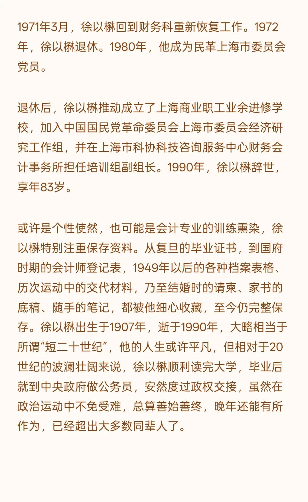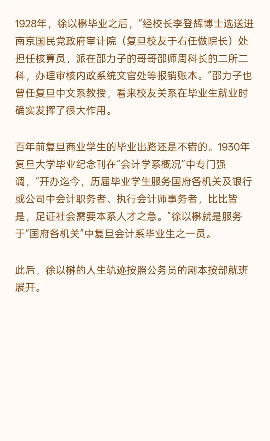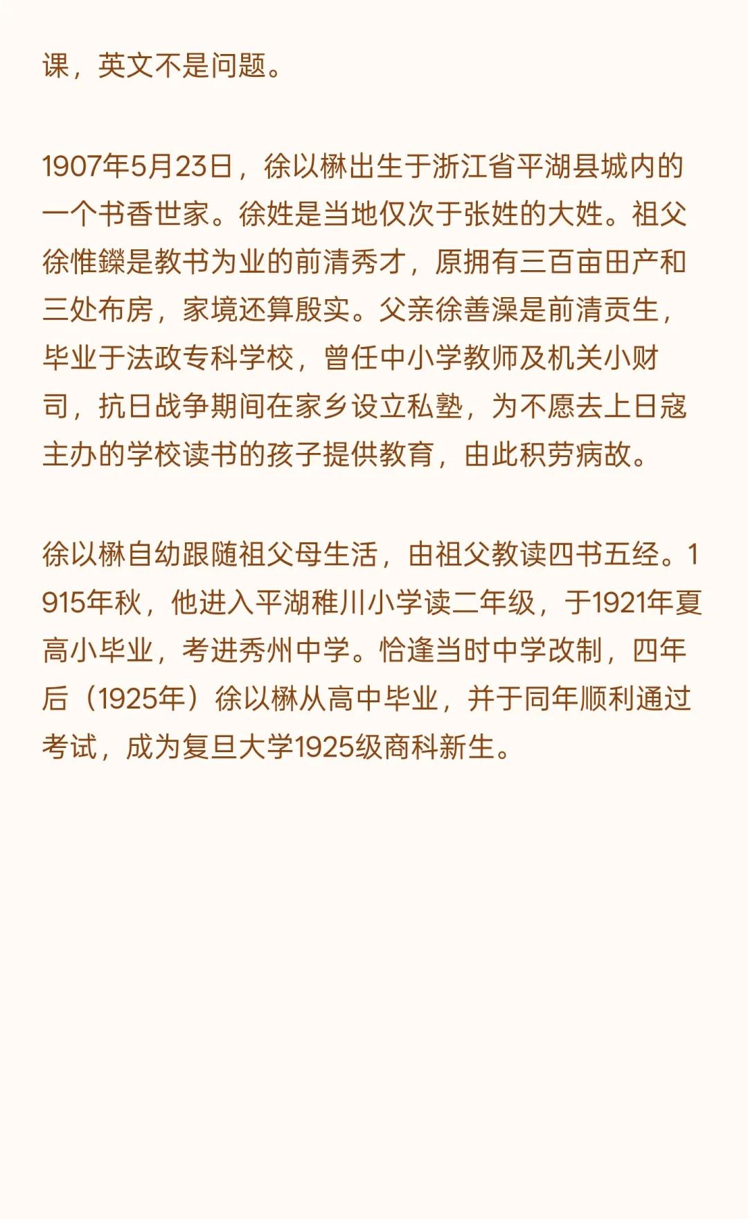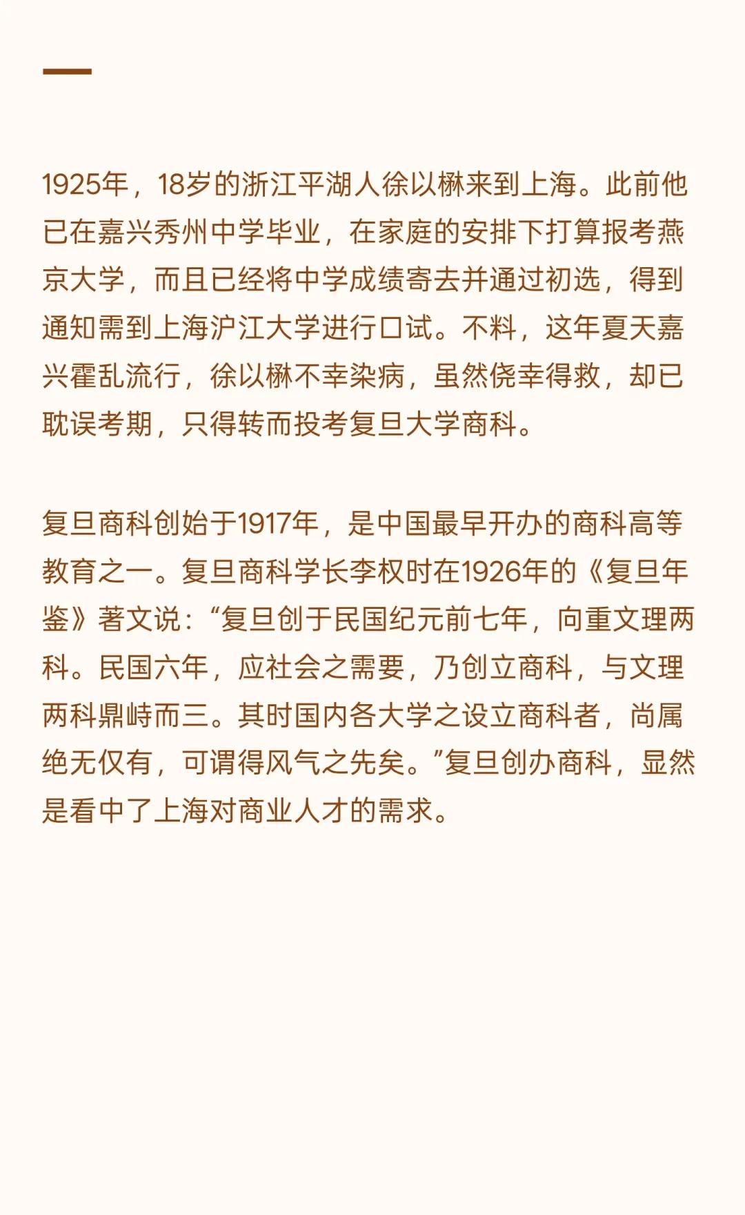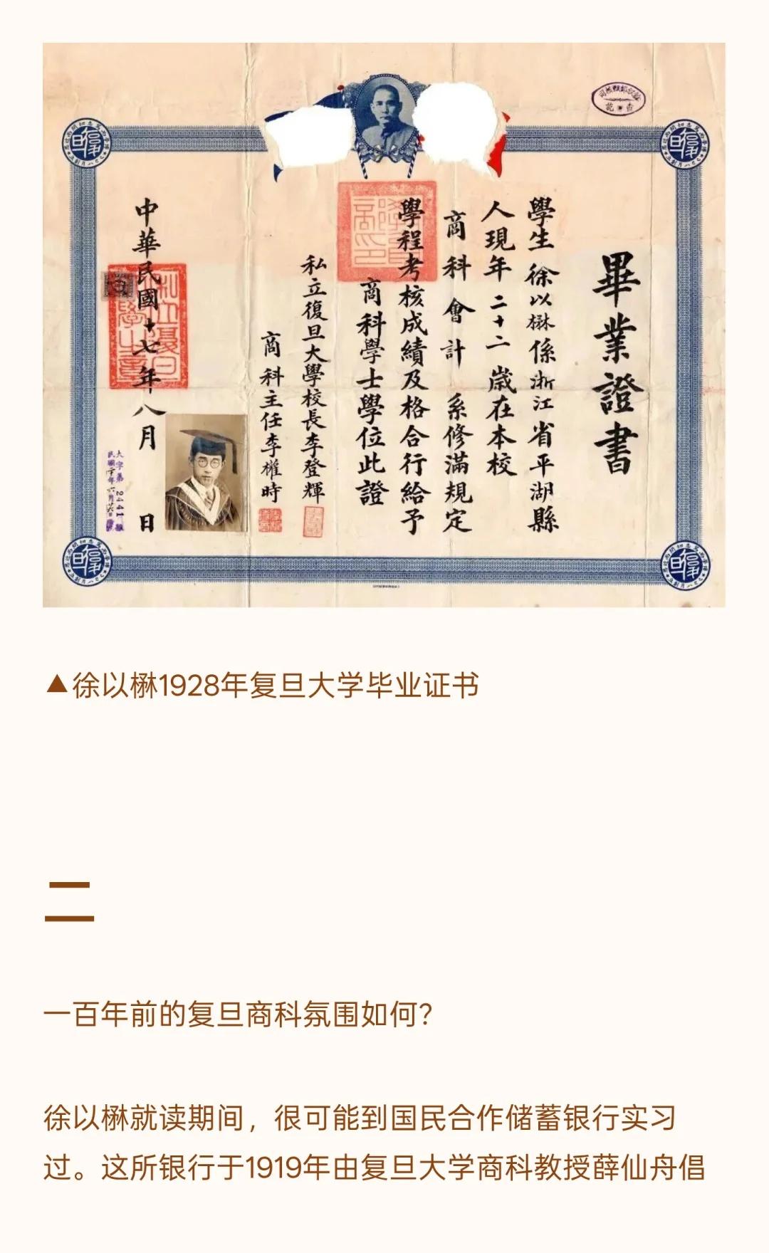 一百年前的复旦商科氛围如何? 2017年7月,复旦大学商科百年纪念之际,我们在复旦档案馆翻阅商科毕业生名录时,“徐以楙”这个名字,首次进入我们的视野。他是谁?他在复旦商科的学习生活究竟是怎样的模样?从复旦毕业之后,他的人生又走向了何方? 一连串问号涌上心头,我们唯有浅浅感叹,或许这份疑问终将无从找寻答案。 🕐 2025年7月24日,一篇题为《在曾祖父毕业的大学门口留影》的笔记,冥冥之中,再次将我们牵引至这个名字的背后。 -------------------------- 🕐 1907年5月23日,徐以楙出生于浙江省平湖县城内的书香世家。 祖父徐惟鑅为前清秀才,以教书为业;父亲徐善澡是前清贡生,毕业于法政专科学校,曾任中小学教师与机关小财司。抗日战争期间,徐善澡在家乡设立私塾,为不愿就读日寇主办学校的孩子提供教育,最终积劳病故。 徐以楙自幼跟随祖父母生活,由祖父教授四书五经。1915年秋,他进入平湖稚川小学读二年级,1921年夏高小毕业,顺利考进秀州中学。恰逢当时中学改制,四年后(1925年),徐以楙高中毕业,并于同年成功通过考试,成为复旦大学1925级商科新生。 百年之后的2025年,亦恰逢复旦大学管理学院恢复建院40周年。循着徐以楙校友后辈悉心留存的一件件老物件、一页页手写日记,我们终于得以解开当年那一连串的问号,重新走进这位复旦会计系学生的内心世界。 🙏 特此鸣谢徐志宏老师。您细致的存档与无私的分享,让我们得以重新走进您祖父的一生。 承载着复旦商科百年记忆的徐以楙校友珍贵日记与史料,将于10月23日在复旦大学管理学院政立院区博物馆全新启幕的“印记管院 拓新领变——大众篆刻作品展”中首次展出。我们一同穿越时光,在一页页手稿与一方方印章中,感受学院厚重的历史文脉与拓新领变的时代精神。 复旦大学 复旦管院 复旦大学管理学院 复旦管院40 复旦管院恢复建院40周年 历史与现在 历史的痕迹 时代的记忆 复旦百年商科