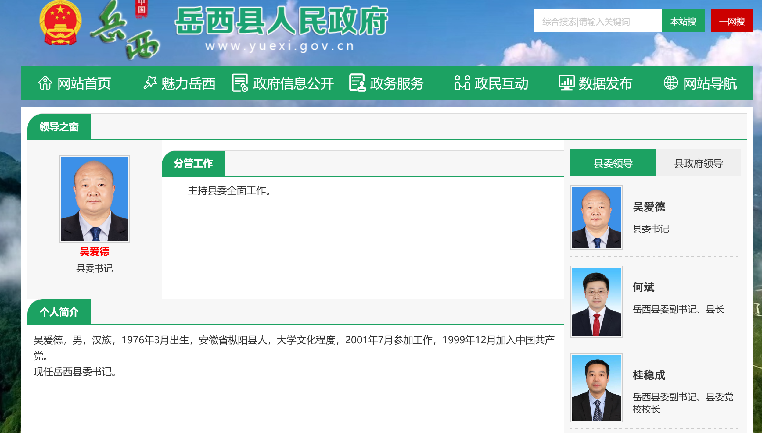 大皖新闻讯岳西县人民政府网领导之窗信息显示,吴爱德现任岳西县委书记,主持县委全面工作。