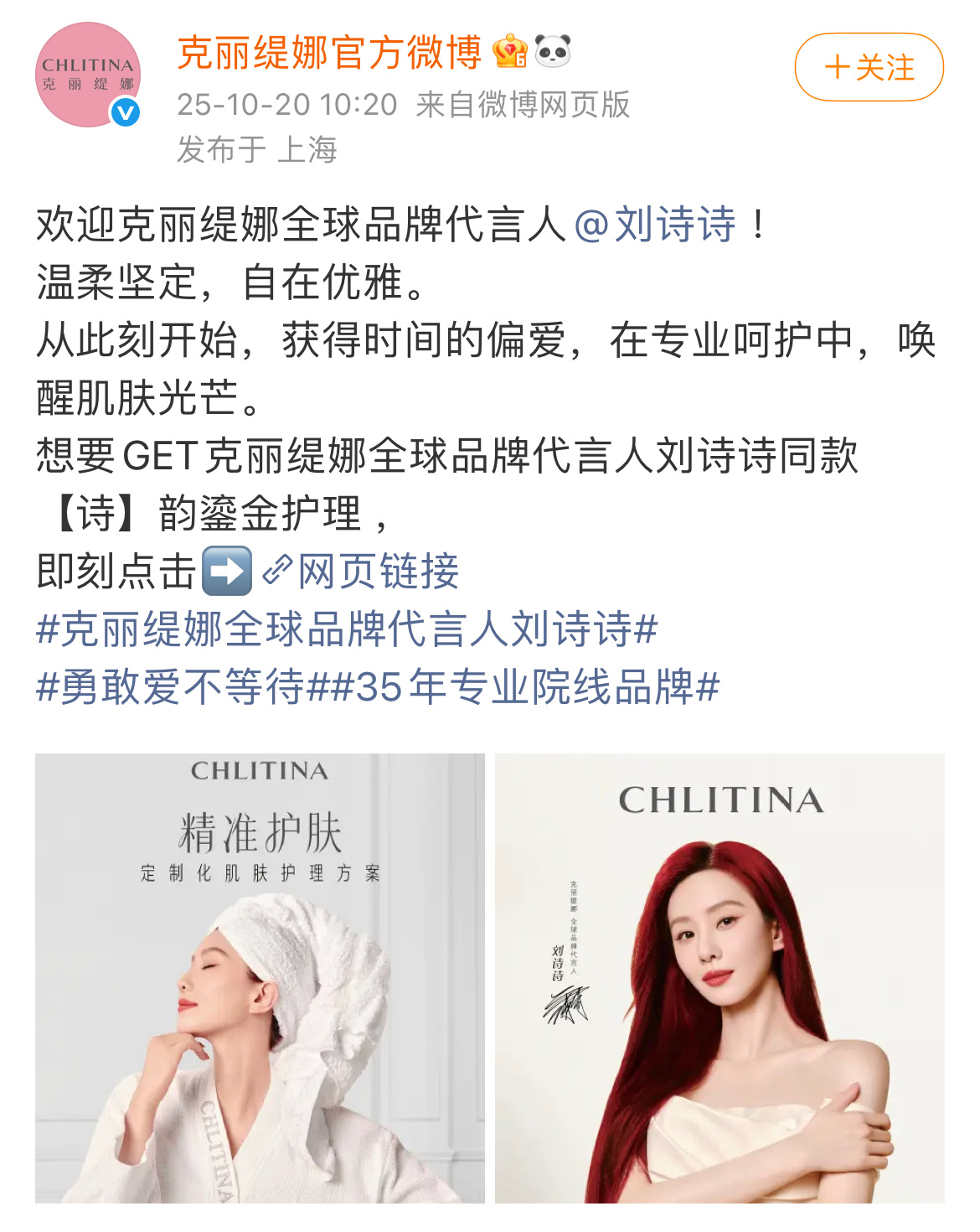 恭喜刘诗诗新增第7个全球代,亚洲500强专业院线品牌-克丽缇娜全球品牌代言人,全