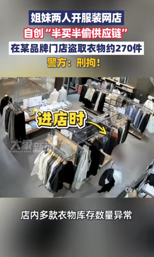 “胆子真大!”10月19日,上海,一对亲姐妹开服装网店,竟然自创“半买半偷”的方式进货,两人在某品牌店前前后后盗取270多件衣服,直到店内员工盘点才被发现,网友:这供应链风险有点高啊! 现在很多人都想开网店,但找个合适的货源并不太容易,都知道质量高价格低肯定能卖爆,可哪里才能找到这种好事呢?某些人就开始动起了歪脑筋。 一对亲姐妹俩开了家网店卖衣服,网店内的衣服都是正品牌子货,价格却比品牌店低不少,很多顾客以为这家网店的老板有渠道,殊不知,这个“渠道”风险还真不小。 为了赚取高额的利润,每当品牌店打折时,姐妹俩就会来到店内购买衣服,她们先挑选几件带去试衣间,将大部分衣服都穿在身上,最外层套上自己的衣物,再假模假样拿几件打折的去前台付款。 靠着这种隐蔽的盗窃方式,两人先后盗取该品牌衣服270余件,都没被发现,直到店内工作人员在盘点库存时发现异常,这才报了警。 警方通过店内的监控发现,有对姐妹每次进试衣间和出试衣间时身材发生巨大变化,立马锁定了犯罪嫌疑人,并将两人抓捕归案。 不少网友调侃这姐妹俩开的网店供应链风险有点高,不得不说,两人的胆子也是真大,在店员的眼皮子底下偷,心理素质也有点太强了,不过,将手伸向不属于自己的东西,结局只有一个,那就是戴上“银手镯”! 信息来源:《姐妹两人开服装网店,自创“半买半偷供应链”,在某品牌门店盗取衣物约270件》大象新闻