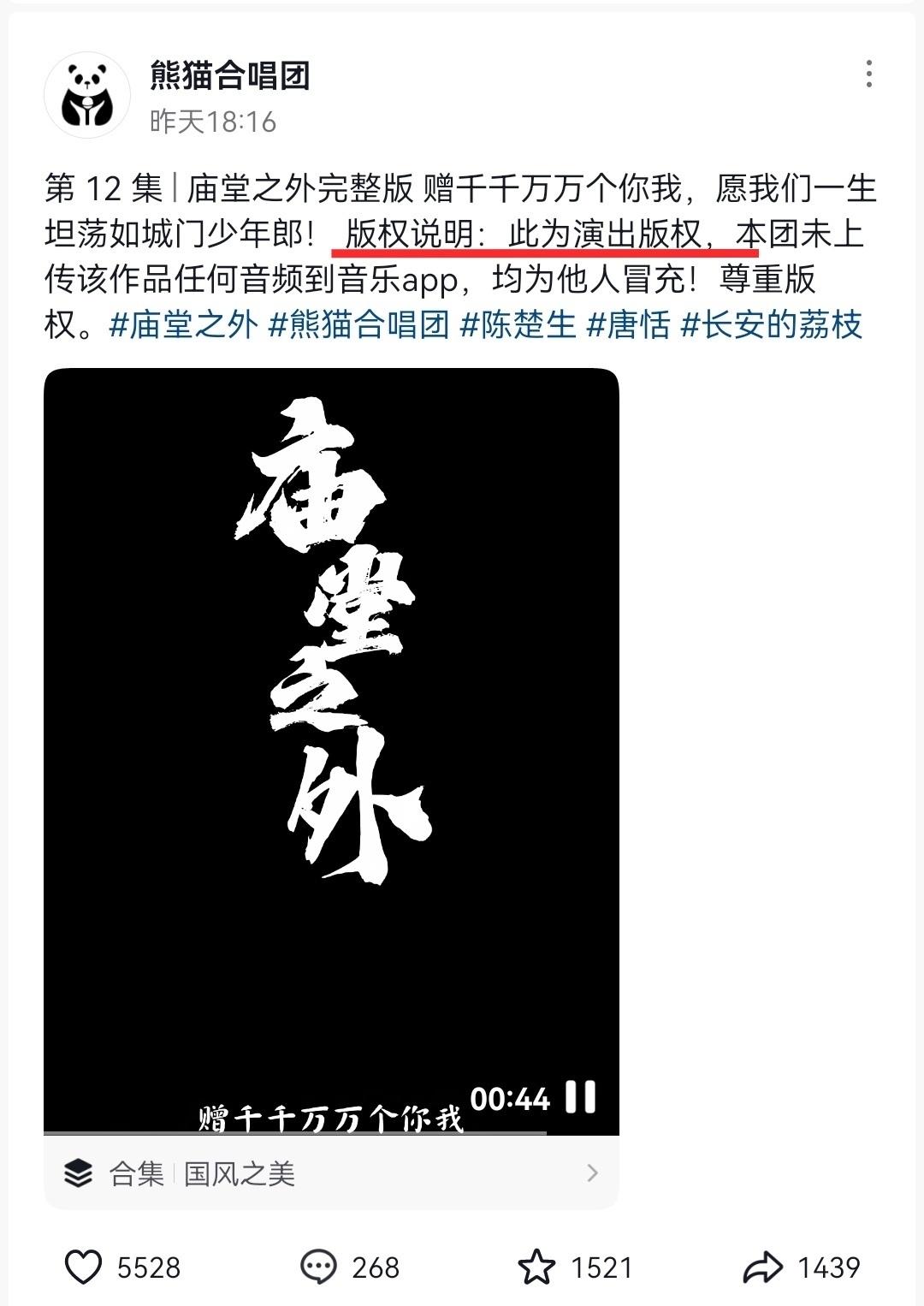咱生哥的亲“儿子”《将进酒》也开始赚钱了! 刚刚刷到的。熊猫合唱团的节目单里其中5首国风大作竟然有陈楚生的两首:一首是他的原创《将进酒》,另一首是他原唱《庙堂之外》。 由此可见,《将进酒》已经开始为生哥赚钱了[赞]。 另外那首《庙堂之外》被誉为只有生哥唱的最好听,很多翻唱都没有生哥的那种味道。 我的头条个人主页被访问1万次啦!