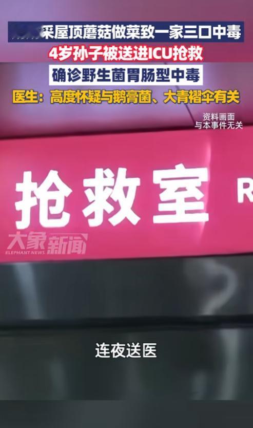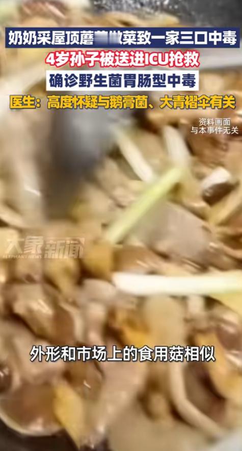 “悲剧还是发生了!”10月20日,福建泉州,一奶奶采摘长在屋顶的野生蘑菇做菜,导致一家三口食用后全部中毒,4岁的小孙子接连呕吐十多次,直接被送进ICU抢救,网友:野生蘑菇不能随便乱吃啊! 入秋后正是各类菌菇生长的旺盛期,也是蘑菇中毒的高发季节,我们都知道颜色鲜艳的蘑菇有毒,殊不知,有些看起来普普通通的野生蘑菇也藏着剧毒。 一奶奶发现自家屋顶上长了好几种蘑菇,这些蘑菇看起来和市场上卖的食用蘑菇差不多,颜色偏灰褐色,便将这些蘑菇采下来做菜给家人吃。 晚饭时,4岁的小孙子大快朵颐,陆续吃了很多蘑菇,父亲回家后也食用了一些,谁知,饭后一家人全部都出现了腹痛、呕吐等症状。 意识到可能是蘑菇的原因,父亲立马对自己进行催吐,将晚饭全吐出来后他感觉好了不少,可吃的最多的小孙子可就遭殃了。 父亲赶忙带着孩子就医,到医院时孩子已经出现了低血压性休克,情况十分危急,医生决定将其送进ICU抢救。 好在经过半个月的治疗,小孙子身体已无大碍,医生怀疑一家人食用的蘑菇很有可能是鹅膏菌、大青褶伞,此类蘑菇外表看起来“无害”,其实毒性一点不少。 不少网友认为孩子奶奶心有点大,不知品种的野生蘑菇也敢乱给家人吃,食用野生蘑菇前一定要确认蘑菇的种类,不是什么蘑菇都能吃! 信息来源:《奶奶采屋顶蘑菇做菜导致一家三口中毒,4岁孙子被送进icu抢救,确诊野生菌胃肠型中毒》大象新闻