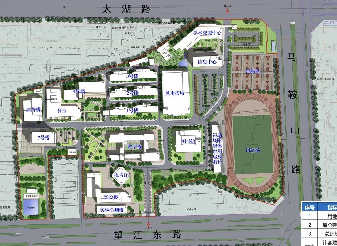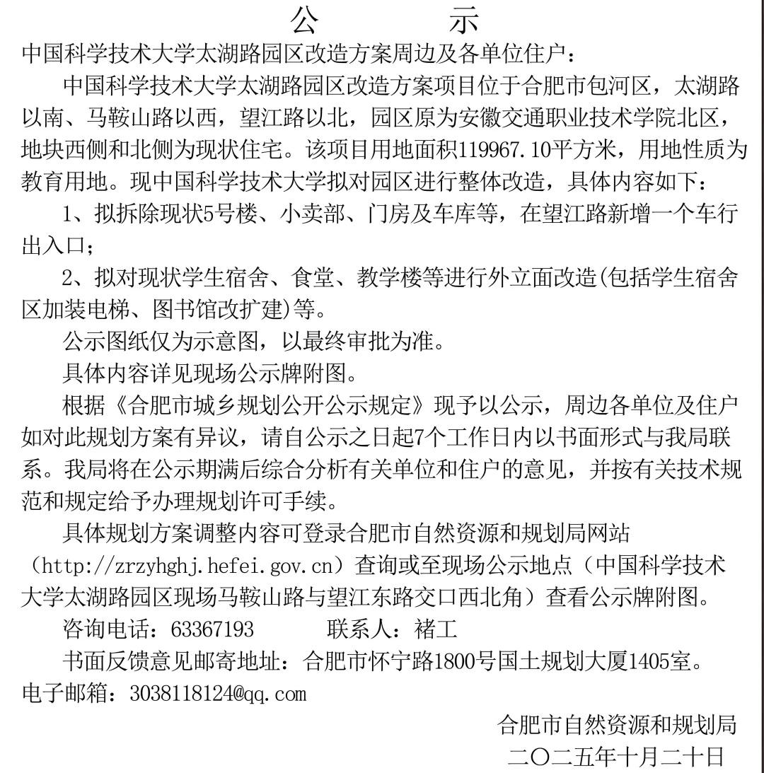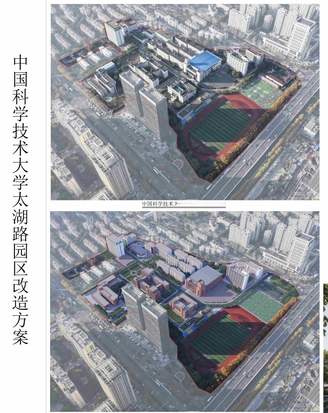 终于!中科大太湖路园区规划公示!👉👉 中国科学技术大学太湖路园区改造方案项目 位于合肥市包河区,太湖路以南、马鞍山路以西,望江路以北 园区原为安徽交通职业技术学院北区,地块西侧和北侧为现状住宅。该项目用地面积119967.10平方米,用地性质头教育用地。 现中国科学技术大学拟对园区进行整体改造,具体内容如下: 1、拟拆除现状5号楼、小卖部、门房及车库等,在望江路新增一个车行出入口; 2、拟对现状学生宿舍、食堂、教学楼等进行外立面改造(包括学生宿舍区加装电梯、图书馆改扩建)等。