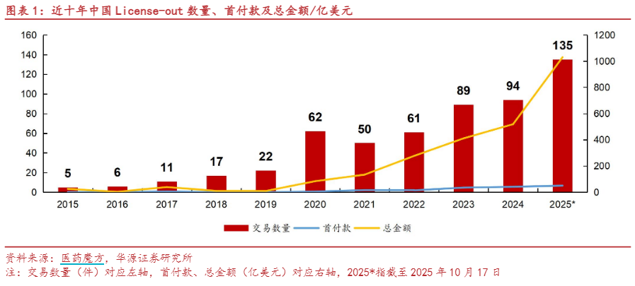据业内机构统计,2025年1月1日至10月17日,国内license-out交易共发生135起,首付款金额总计49.76亿美元,总金额达到1029.96亿美元,体现了国际医药产业龙头对中国创新药资产的高度认可。华源证券指出,当下中国创新药资产兼具广度和深度,其“质优价低”的特色正驱动中国创新药走向国际掘金全球市场,建议关注2025年4季度BD催化投资机会。