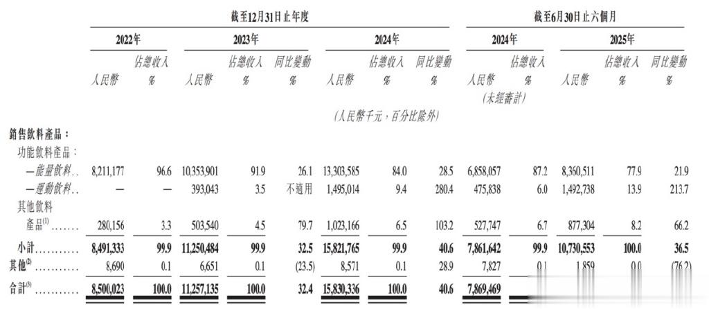 然而,东鹏饮料收入结构单一的问题仍待破解。据招股书数据显示,2022年至2024年,该公司的能量饮料收入分别达到82.11亿元、103.54亿元和133.04亿元,占公司各年总营收比重均在八至九成以上,分别为96.6%、91.9%和84.0%。时至2025年上半年,能量饮料收入占比仍达到77.9%,而同期的运动饮料、其他饮料产品(包括茶饮料、咖啡饮料、植物蛋白饮料、果蔬汁饮料等)收入分别仅占13.9%和8.2%。一旦能量饮料业务受到市场波动、消费者偏好变化、战略决策偏移等影响,将对公司业绩造成打击。
