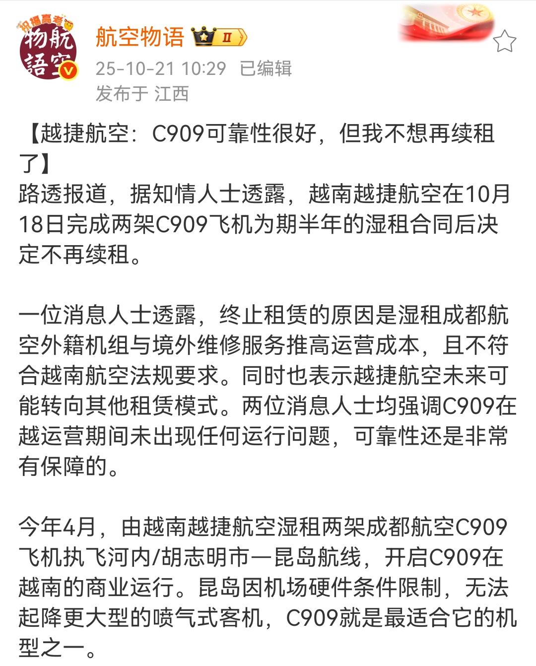 越捷航空:C909可靠性很好,但我不想再续租了 越捷航空是廉价航空公司,由于采用湿租方案,飞行员和乘务员都是外籍的,而且还要付很高昂的工资越捷航空承受不住啊。 飞机的维护保养也是问题,要依赖国外的团队,最好的方法就是从越南飞到成都,这是最方便的处理方式。 目前也只有印尼的翎亚航空公司能把这个飞机玩出花,他们每天的日用率非常非常的高,超过了绝大多数航空公司能够达到的能力。