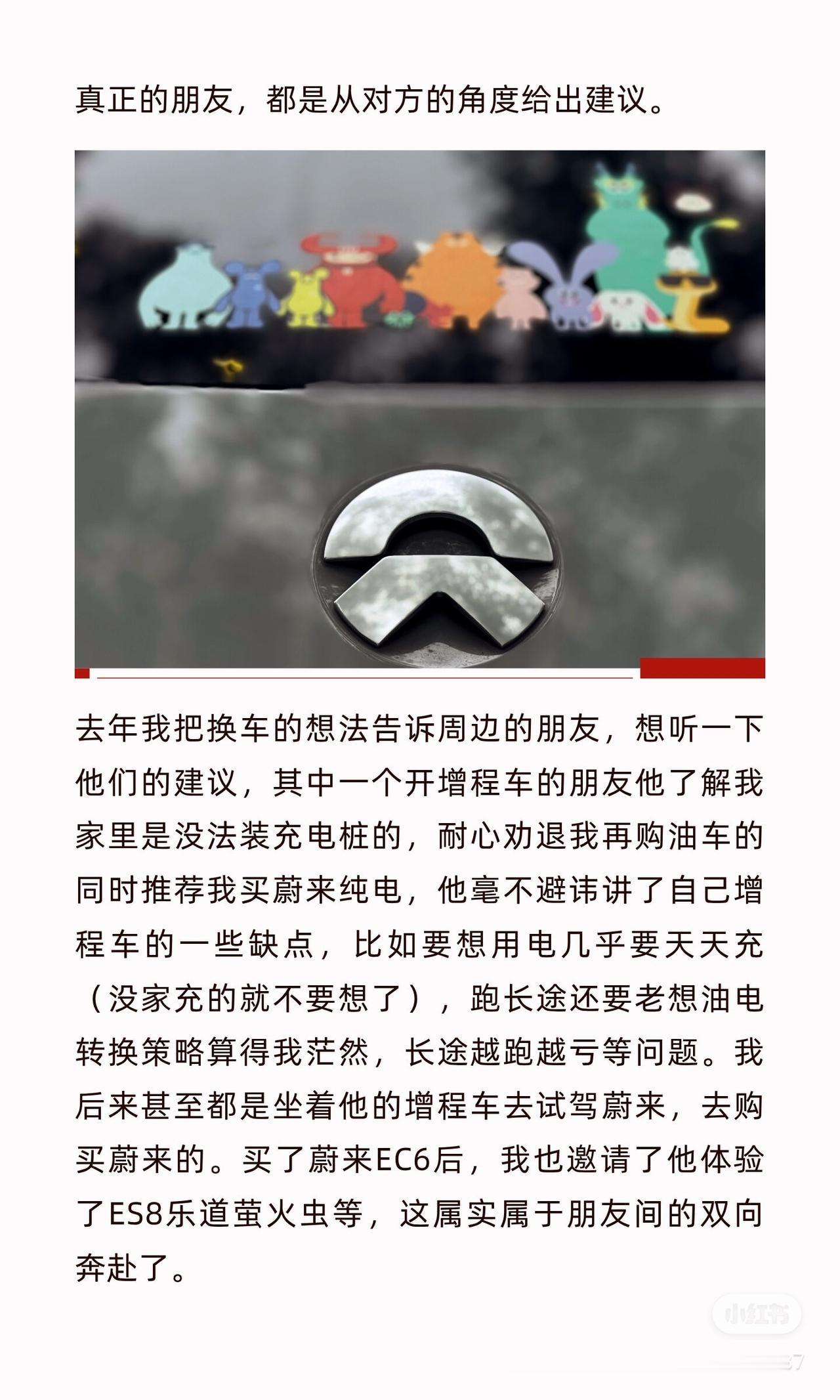 增程车主推荐我买了蔚来 真正的朋友,都是从对方的角度给出建议。 去年我把换车的想法告诉周边的朋友,想听一下他们的建议,其中一个开增程车的朋友他了解我家里是没法装充电桩的,耐心劝退我再购油车的同时推荐我买蔚来纯电,他毫不避讳讲了自己增程车的一些缺点,比如要想用电几乎要天天充(没家充的就不要想了),跑长途还要老想油电转换策略算得我茫然,长途越跑越亏等问题。我后来甚至都是坐着他的增程车去试驾蔚来,去购买蔚来的。买了蔚来EC6后,我也邀请了他体验了ES8乐道萤火虫等,这属实属于朋友间的双向奔赴了。 换蔚来九个月,蔚来也一直带给我很好的用车体验,尤其在换电这一块,毕竟我因为没家充的原因很少进行充电。家周边3公里,公司周边3公里都有好几个换电站,这种环境下,能换电谁还去充电。而且蔚来的换电站重点不仅是城市里,很多自驾线路也是其布站重点,这就很好解决了通勤和旅游的补能问题,目前全国已经超3500个换电站,超27000根蔚来充电桩,318等旅游热线也逐步实现一路换电。 所以回过头来还是要感谢我这增程车主朋友,他的推荐太贴心。 蔚来