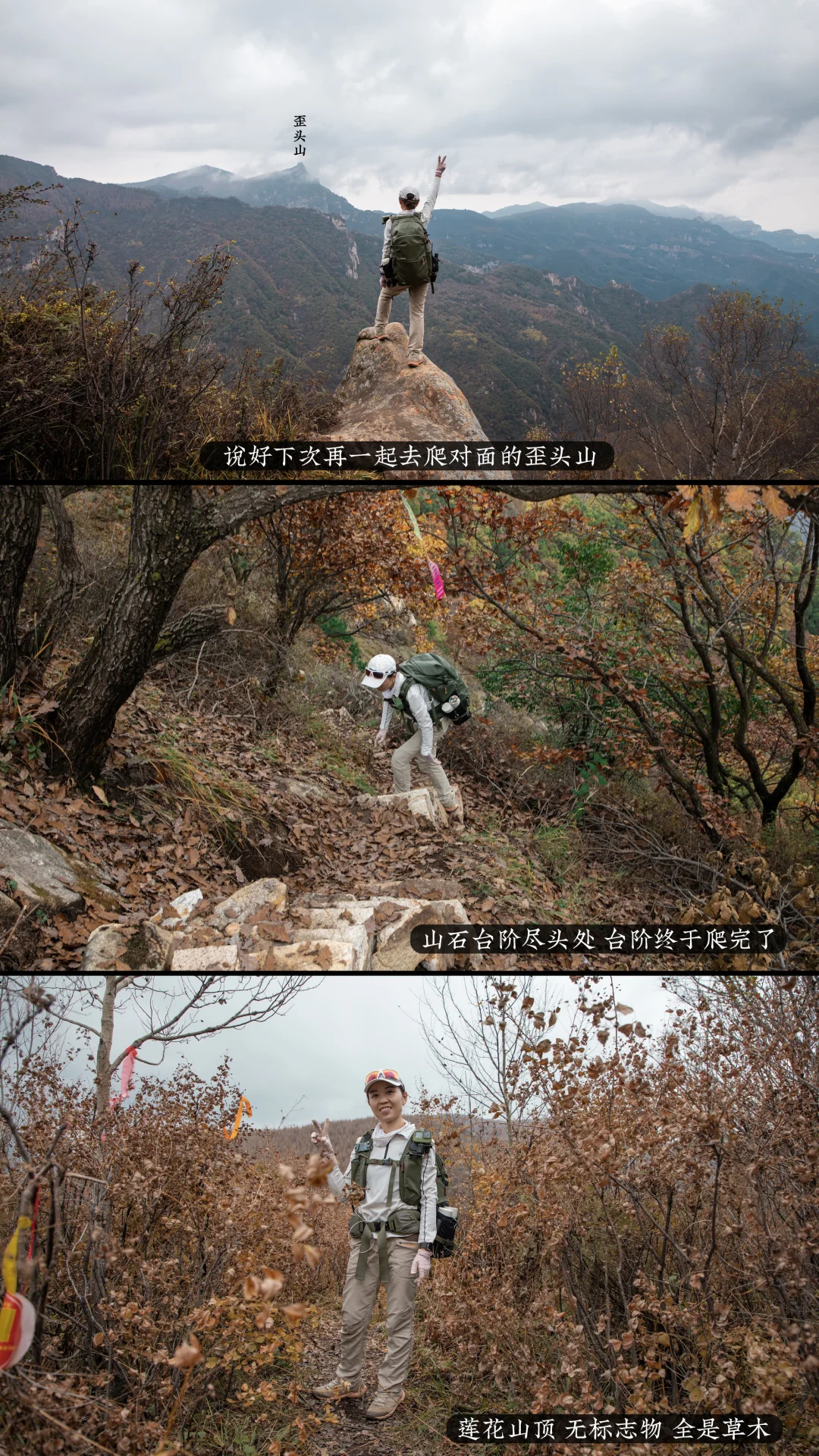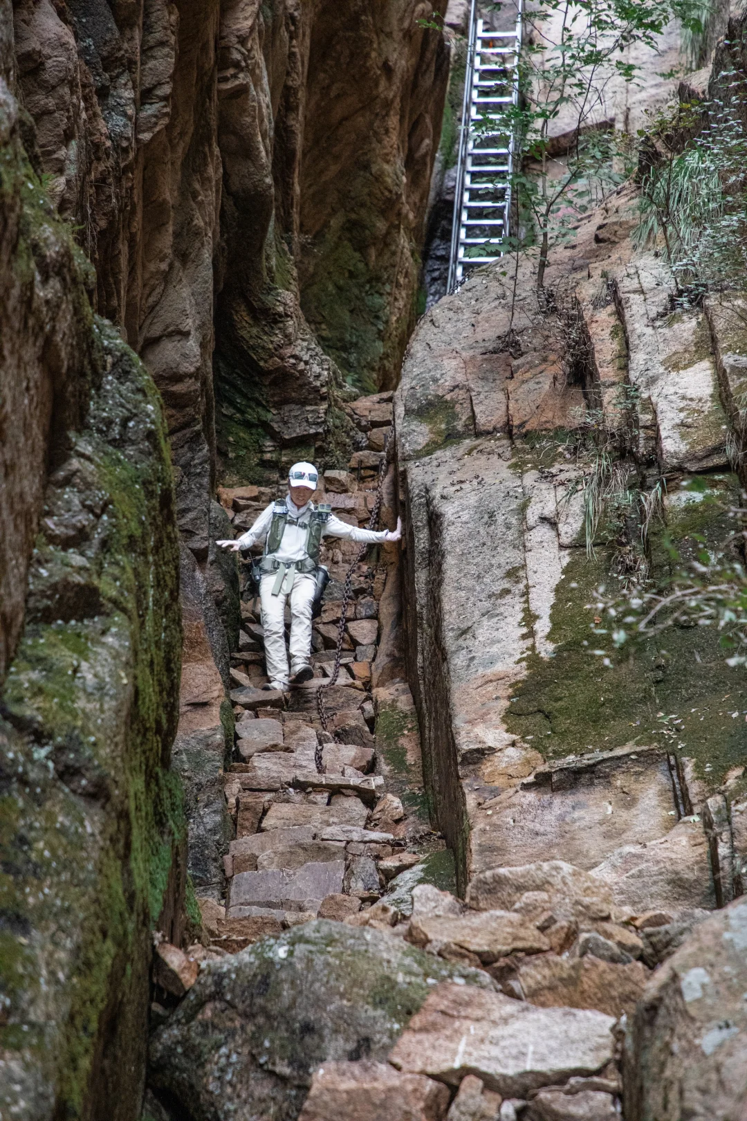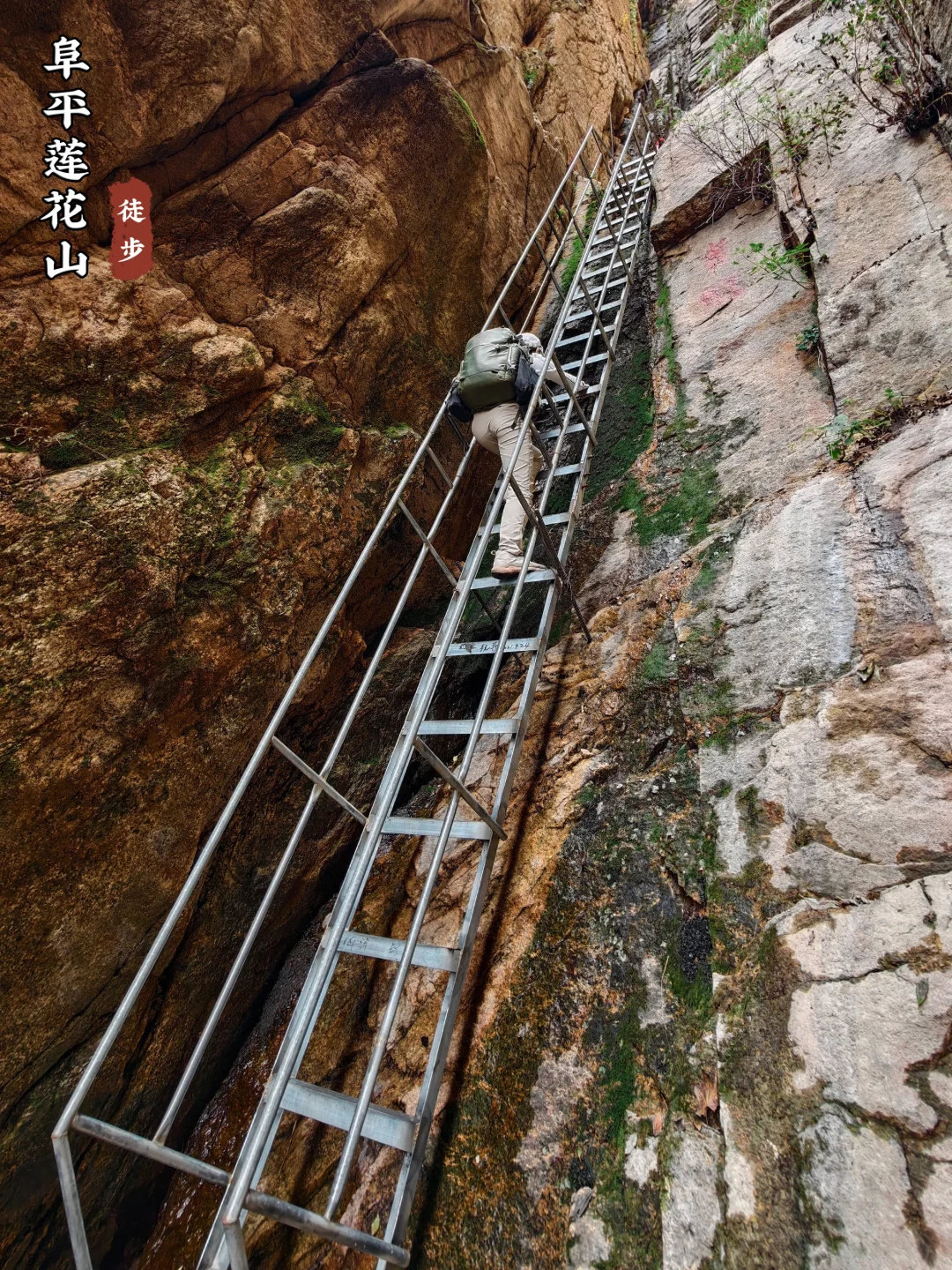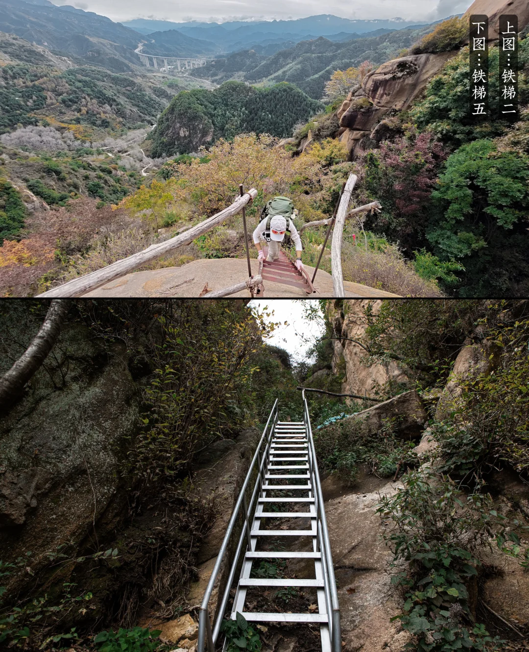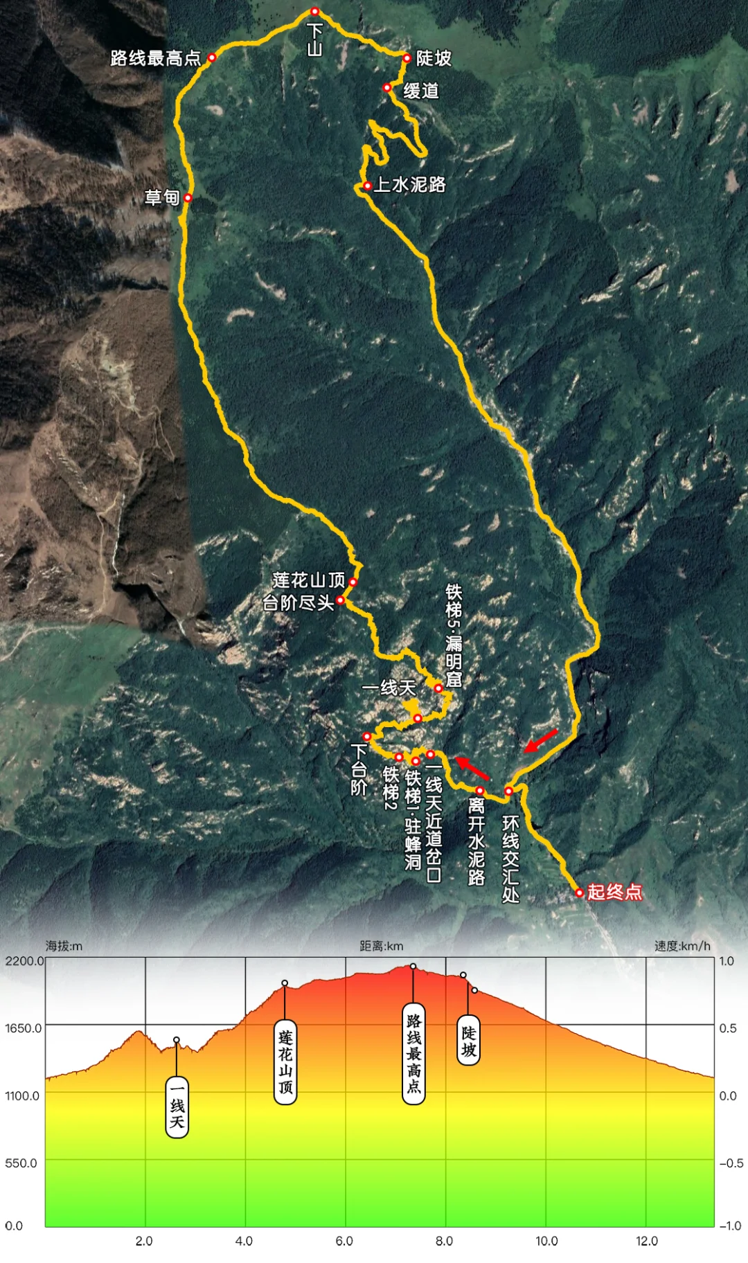 路况:水泥路、山石台阶、山间土路、爬岩石上的铁梯铁链钢钉、林间小道、山脊草甸、陡坡、山腰小道
