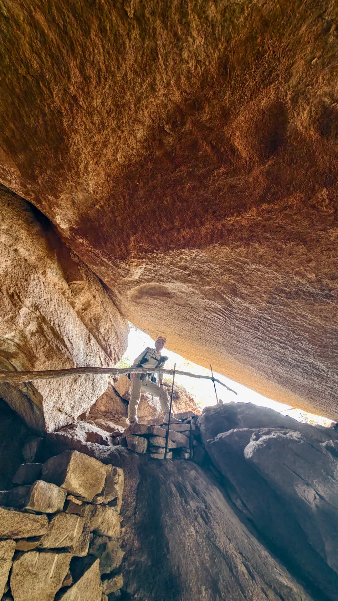 [向右R]1公里到一线天近道岔口,往右直接上到一线天,但会错过两处铁梯和驻蜂洞;我们是往右吭哧吭哧上爬后,还要台阶下来,就是为多体验体验,哈哈~