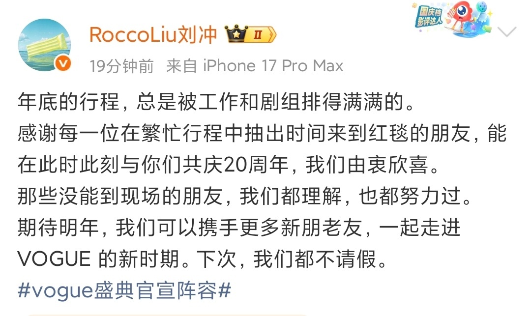娱乐[超话]刘冲回应vogue阵容争议刘冲回应vogue20周年盛典阵容刘冲回应