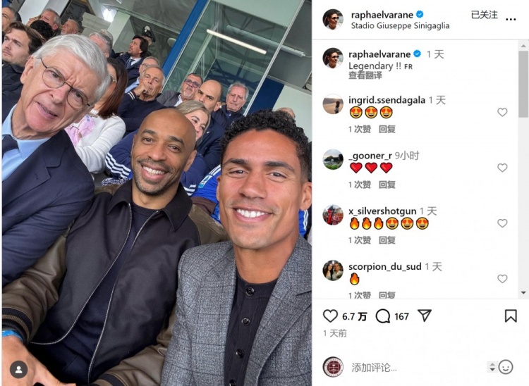 观战科莫vs尤文!瓦拉内社媒晒与温格、亨利合照:传奇