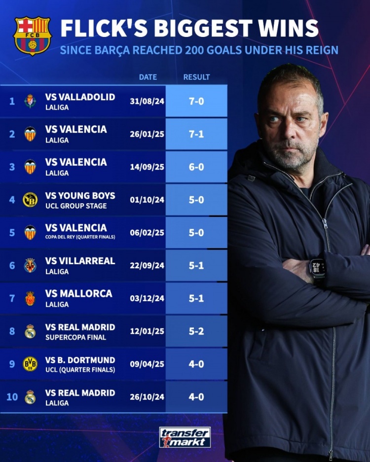直播吧10月21日讯德国转会市场统计了弗里克执教巴萨以来的数据,他带队参加71场比赛,打进201球。
