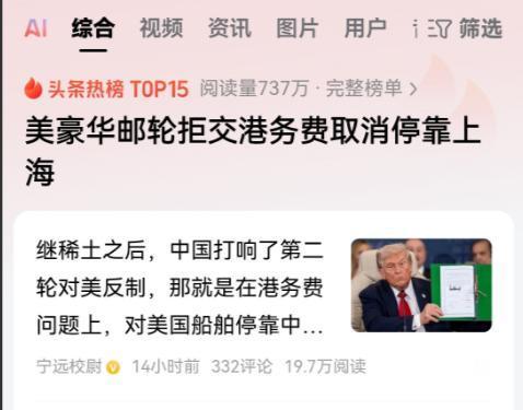 交不起了,实在是交不起了!由于中国的对等反制,很多美国的船只已经放弃停靠中国港口。   这艘邮轮叫蔚蓝海岸号,本来按计划要停靠中国上海港。刚好赶上中国新政策实施,得交那么多港务费。它拿不出钱,只能被迫放弃停靠,船上一船游客也得跟着换旅游线路。   事情的起因是美国先对中国船只加收港口费,2025年10月14日,美国以“保障供应链安全”为由,对中国企业拥有、运营或建造的船舶加征高额港口服务费。   中国当天就宣布了反制措施,对美国船只按净吨位分阶段征收特别港务费,2025年是每净吨400元,到2028年要涨到每净吨1120元。而且,一艘船一年最多收5次,要是同一航次停靠多个中国港口,只在第一个港口收费。   蔚蓝海岸号是美国诺唯真邮轮公司的船,净吨位大概2.9万吨。按照2025年的标准,它停靠一次上海港就得交1167万元港务费。要是一年来5次,就得交5835万元,到2028年就涨到1.63亿元了。   一艘豪华邮轮跑一趟的净利润也就200万到300万元,这港务费直接把利润全吞了还得倒贴。所以,邮轮公司只能取消上海的行程,改道去韩国釜山。   这一改道,船上1250多名游客可就倒霉了。他们好多人都是特意安排了上海的行程,结果突然被通知改线路,好多预订的酒店、门票都得取消,还得重新规划旅游路线。邮轮公司也得承担游客的投诉和赔偿,初步估计赔偿成本超过300万元。   美国这么一搞,受伤的可不只是邮轮公司。美国的商船也面临同样的问题。美国美森航运的“曼努凯”号集装箱货轮,在宁波港就被收了446万元特别港务费。还有一些美国航运公司,为了避免交这笔钱,只能调整航线,把货物先运到韩国釜山,再中转到中国。这样一来,运输时间就得增加3到5天,成本也跟着上去了。   美国的如意算盘是想通过加征港口费来打击中国的造船业,可没想到反而把自己坑了。美国的民用船厂现在只剩下7家,而且还得依赖中国的零部件。像美国造船用的铌钢、电子导航系统,六成都是从中国进口的。中国这反制措施一出来,美国造船成本更高了,竞争力就更弱了。   再看看中国这边,不仅没受啥影响,反而还因祸得福。中国的造船厂因为政策豁免,接到了更多订单。像首艘国产大型邮轮“爱达·魔都号”,从2024年1月首航到2025年3月,已经完成了100个商业航次,服务了超过35万人次。还有欧洲的一些邮轮公司,看到美国船在中国港口的麻烦,赶紧和中国合作,抢占市场份额。   美国的这波操作,就像是搬起石头砸自己的脚。本来想给中国点颜色看看,结果自己的航运业、造船业都受到了重创。现在美国国内也开始有人抱怨,说这种单边主义的做法根本行不通,只会让美国的经济越来越糟糕。   中美之间的这场港口费博弈,其实就是两国经济实力的较量。中国有完整的工业体系和庞大的市场,根本不怕美国的制裁。而美国在全球化的今天,还想着用这种老套的手段来打压对手,显然是跟不上时代的步伐了。这场博弈的结果也告诉我们,在国际贸易中,合作共赢才是正道,搞单边主义和贸易保护主义,最终只会损害自己的利益。