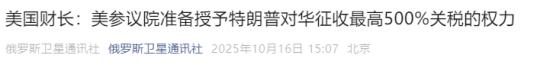 美财长:美国参议院即将授权特朗普,对中国加征500%关税。不仅加征关税,美财长还放话:“如果美国推迟稀土限制计划,美国可以考虑暂停对中国高关税的期限。” 要知道,500%的关税已经不是简单的贸易保护,而是直接掀桌子的节奏了。美国政府这是打算把当年对付俄罗斯的那套高关税、供应链脱钩的招数,原封不动地搬到中国身上啊。 可问题是,现在的中国早就不是当年的俄罗斯了。俄罗斯经济结构单一,过度依赖能源出口,所以美国一制裁油价,俄罗斯经济就疼得嗷嗷叫。 但中国不一样,中国有全球最完整的工业体系,14亿人口的大市场,还有“一带一路”朋友圈的支持。美国想靠高关税把中国经济打趴下,简直是异想天开。 就拿这次来说吧,美国这边刚放出加征500%关税的风声,中国商务部马上就宣布,从11月8日起对稀土设备、锂电池等关键物项实施出口管制。这招直接戳中了美国的软肋。 稀土别看名字不起眼,却是高科技产业的“维生素”。从手机、电脑到导弹、战斗机,都离不开稀土。中国控制着全球70%的稀土开采和90%的加工能力,美国80%的稀土都得从中国进口。 更关键的是,稀土冶炼分离技术几乎被中国垄断。美国就算能开采出稀土矿石,也得运到中国来加工。 这次中国对稀土设备实施出口管制,美国的军工企业马上就慌了。洛克希德·马丁公司的F-35战斗机生产线已经因为稀土供应不足停摆了,波音公司的787梦想客机交付也延迟了。 美国政府一看中国反制这么狠,马上就软了下来。贝森特赶紧放话,说如果中国取消稀土出口管制,美国可以考虑暂停对中国高关税的期限。这话听起来好像是美国在让步,其实是在耍心眼儿。 美国想拿稀土限制当筹码,迫使中国在贸易谈判上妥协。可中国根本不吃这一套。商务部发言人明确表示,稀土出口管制是基于国家安全的正常举措,不针对任何国家,也不接受外部胁迫。 其实美国政府心里比谁都清楚,500%的关税根本不可能真正实施。首先,这么高的关税违反世界贸易组织规则,会让美国在国际上陷入孤立。其次,美国企业和消费者根本承受不起。美国从中国进口的商品中,有很多是日常生活必需品,比如衣服、鞋子、电子产品。 如果加征500%的关税,这些商品的价格会暴涨,美国消费者的生活成本会大幅增加。美国零售商协会已经警告说,如果关税真的实施,美国零售业将损失数千亿美元,数百万个工作岗位将消失。 更讽刺的是美国政府这次加征关税的理由根本站不住脚。美国指责中国从俄罗斯进口石油,可自己却一直在大量购买俄罗斯的石油和天然气。 就在今年9月,美国从俄罗斯进口的石油量还创下了历史新高。这不是典型的“只许州官放火,不许百姓点灯”吗?而且,中国从俄罗斯进口石油是正常的国际贸易行为,符合国际法。美国有什么资格指手画脚? 其实,美国政府这次的举动,更多的是一种政治作秀。特朗普政府想通过对华强硬来转移国内矛盾,掩盖自己在经济治理上的失败。 很明显在这场贸易战中,中国始终保持着战略定力。一方面,中国坚决反制美国的无理行径,维护自己的合法权益;另一方面,中国也一直在推动与其他国家的合作,扩大“一带一路”朋友圈,降低对美国市场的依赖。 总的来说美国政府这次的“500%关税威胁”,不过是虚张声势而已。中国早就不是那个任人欺负的弱国了。在这场贸易战中,中国有底气、有能力奉陪到底。而美国政府如果继续执迷不悟,最终只会搬起石头砸自己的脚。正如中国商务部发言人所说:“打,奉陪到底;谈,大门敞开。”美国政府是时候放下身段,回到谈判桌前,与中国进行平等、互利的对话了。否则,美国经济只会在错误的道路上越走越远。 来源:俄罗斯卫星通讯社 【美国财长:美参议院准备授予特朗普对华征收最高500%关税的权力】